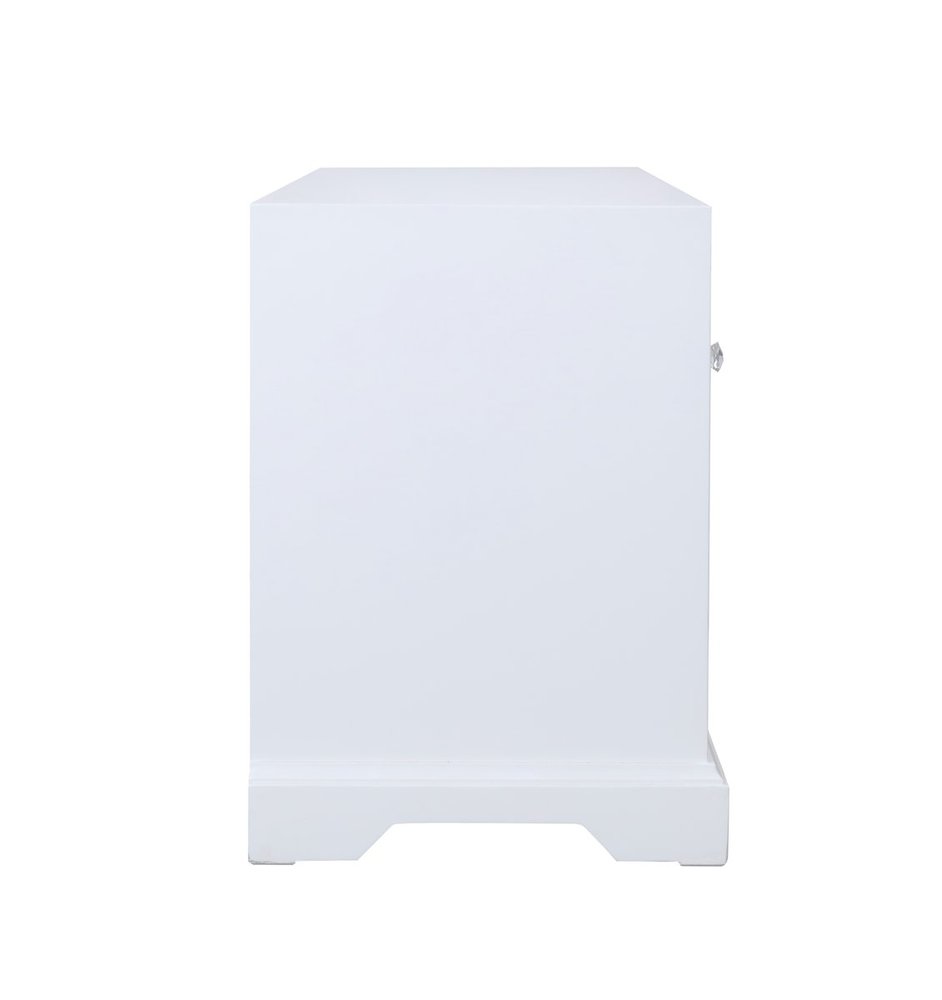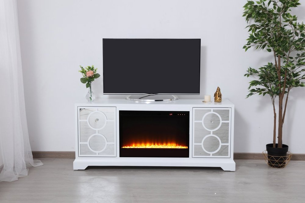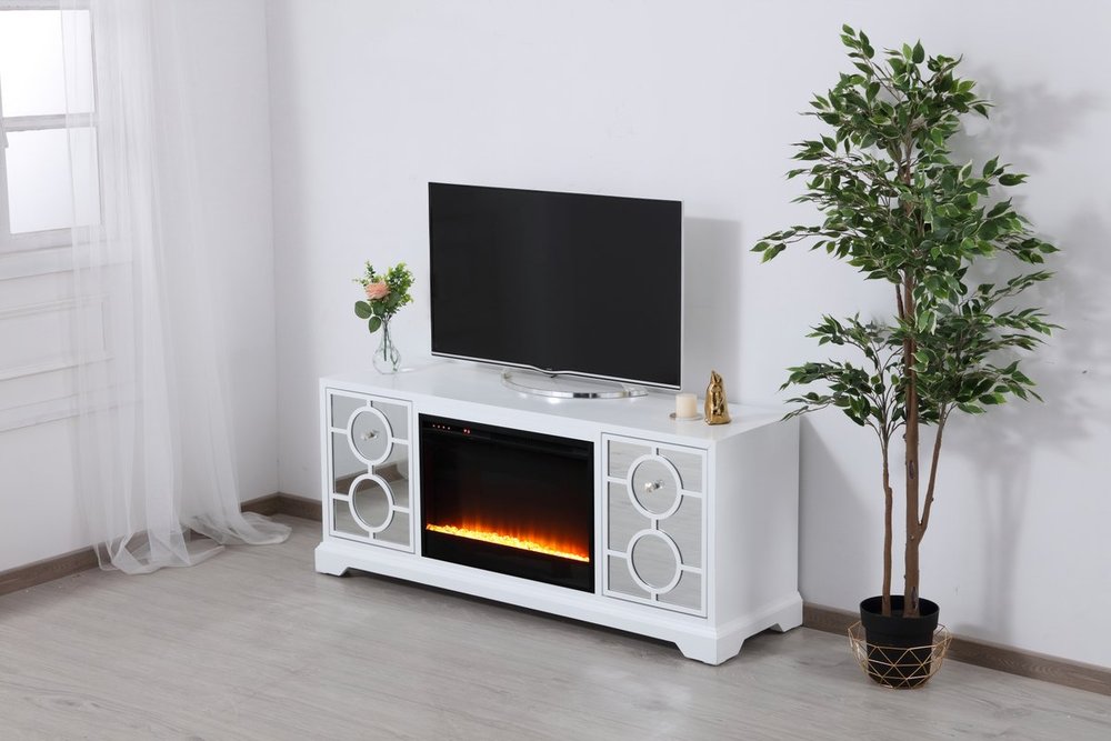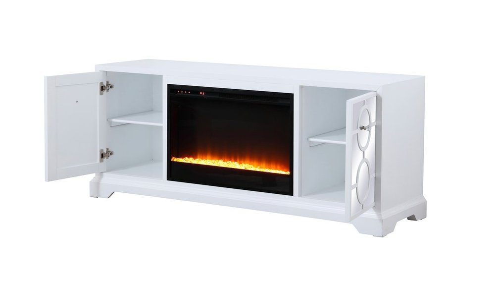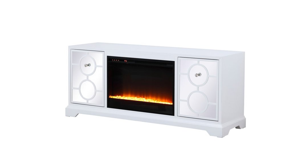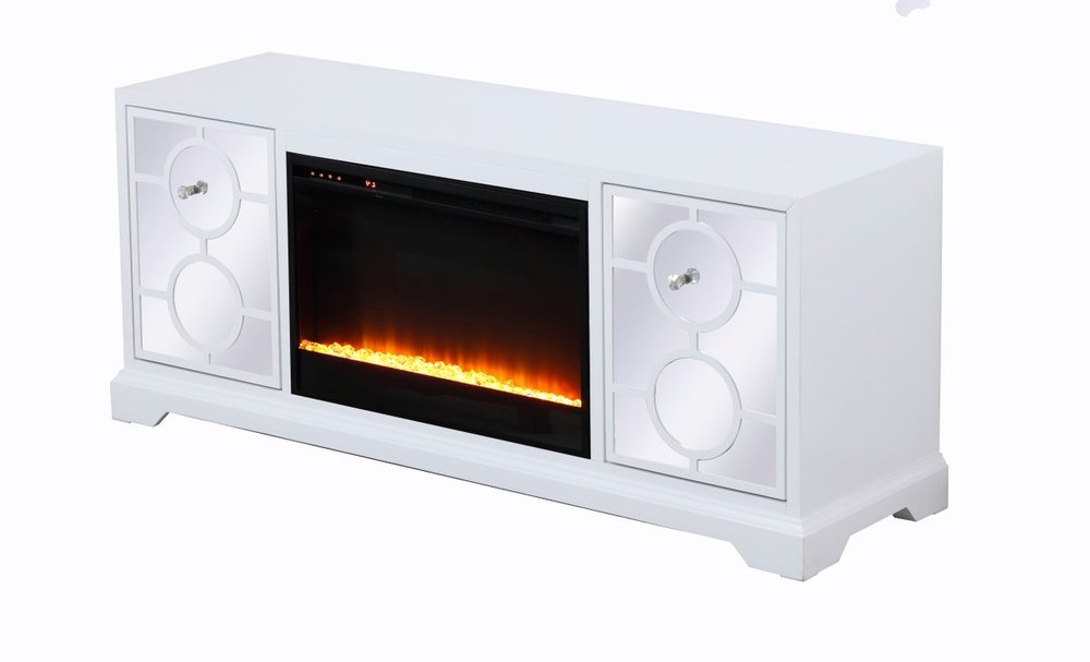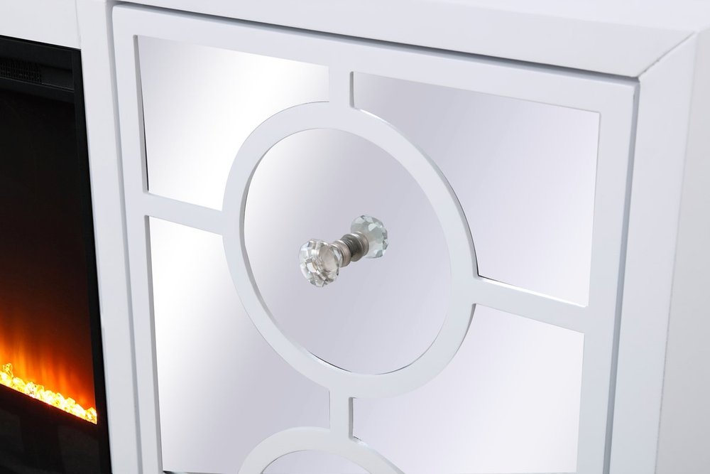 Sleek and vibrant, this transitional media fireplace cabinet combo will make a striking statement in any room can showcase up to a 60" flat screen TV at a perfect height. Featuring top-quality mirror panel with circle overlay and hand-painted in a semi-gloss white finish, accentuated with crystal square knobs. Functional and chic, it features 2 side doors. This includes the electric crystal fireplace insert that is easy to install into the cabinet. Beautiful crystals adorn the base of the fireplace. Set the mood with adjustable temperature and lighting settings.