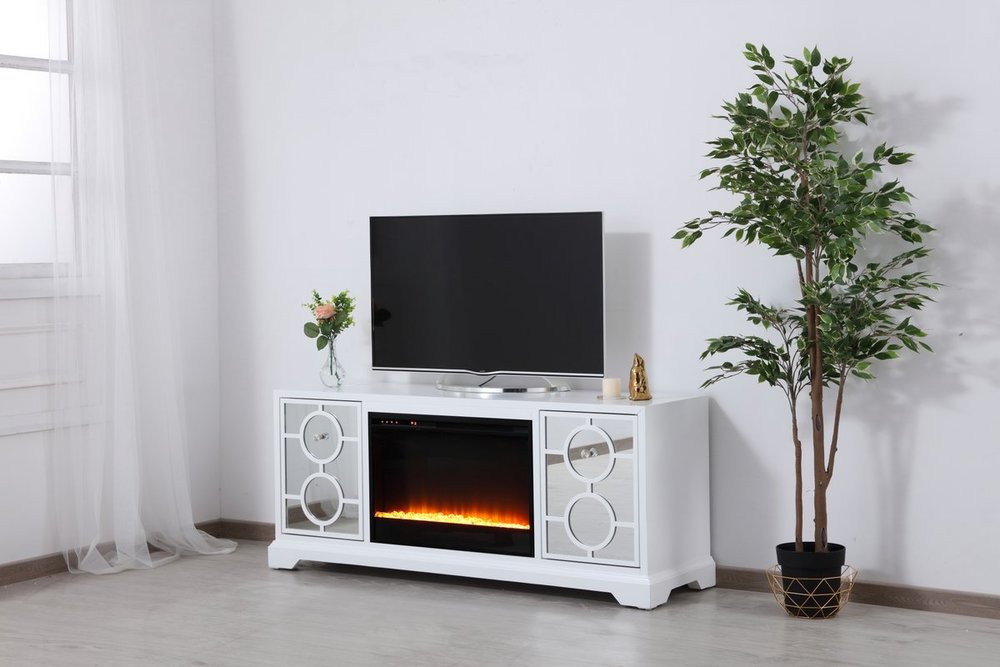 60 in. mirrored TV stand with crystal fireplace insert in white