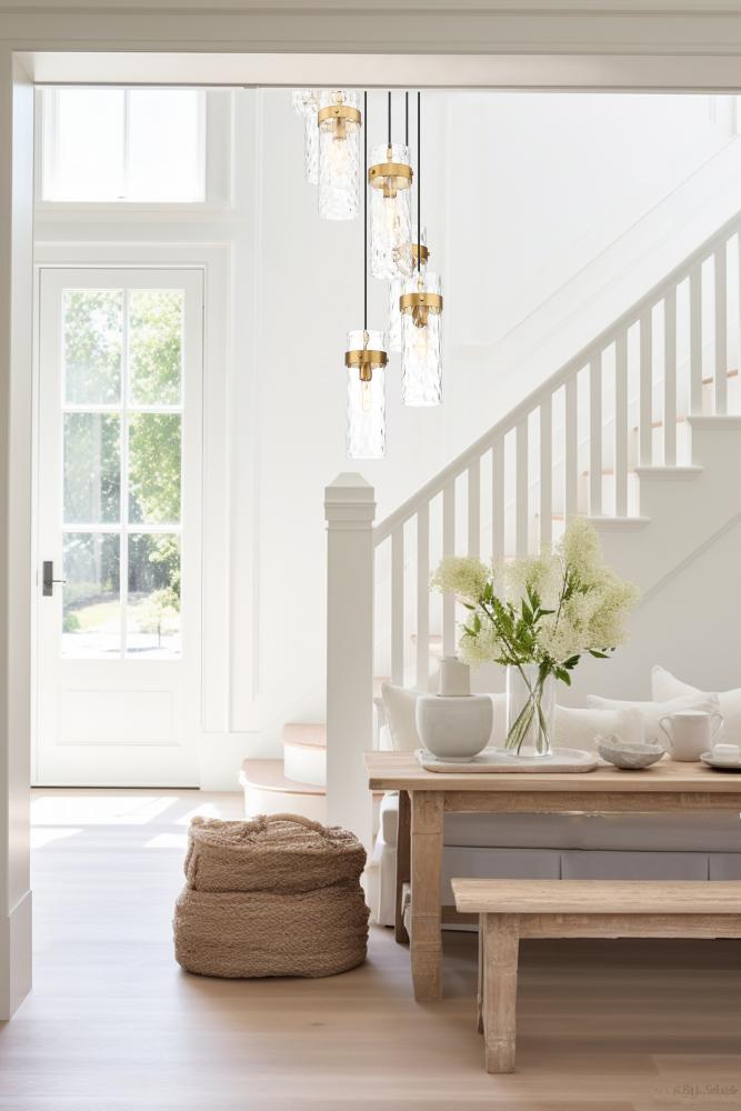 Rubbed brass finishing sets a warm, refined tone for this modern seven-light chandelier. Its round canopy hosts a spiraling fall of cylindrical shades, each featuring clear water glass and a metal collar. Braided cord adds a refined touch, perfect for an opulent focal point fixture in your living or dining room.