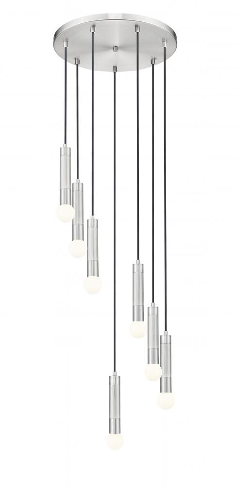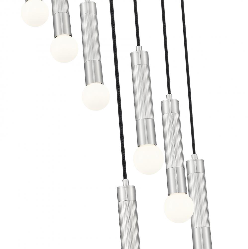 A spiraling effect is created with the staggered lights featured on this modern seven-light round chandelier. Each light features a braided black cord and an elongated tube, with a petite light that casts inviting ambiance over your entry, living or dining room. A brushed nickel finish adds gleaming elegance and ensures a versatile look to complement surrounding decor.