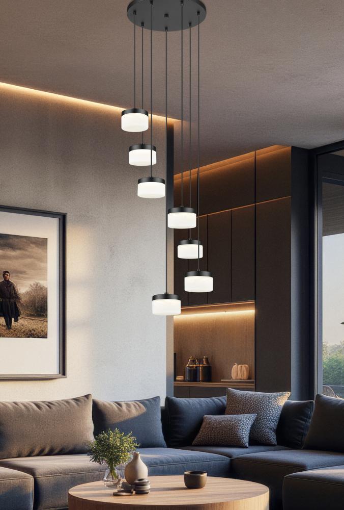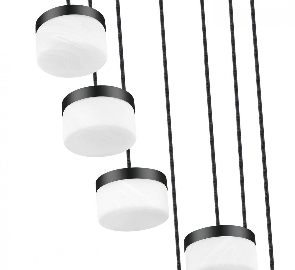 Suspended from a round canopy, this matte black 7-light LED chandelier lets its clouded glass shades fall in a gentle stagger, turning a tall foyer or stairwell into a place people naturally pause to look up. The deep frame outlines the composition with just enough contrast that the bright, feathered glass stays the star while still coordinating with dark hardware and interior accents.