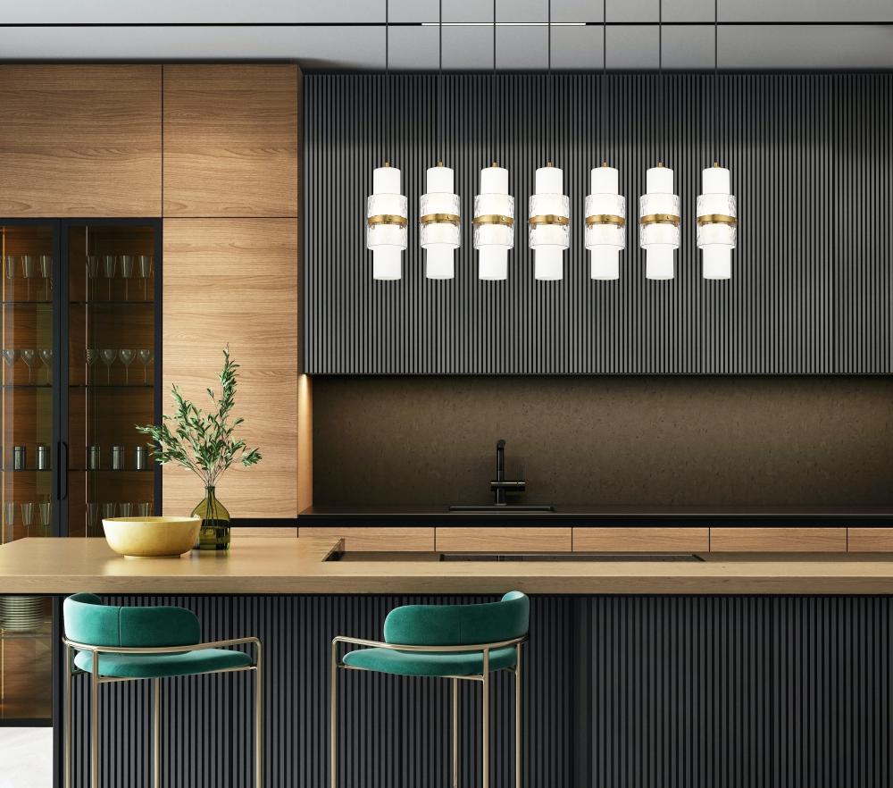 A modern seven-light island chandelier introduces sophisticated energy and elegance in an inviting kitchen. In a modern gold finish, it boasts a slim canopy and braided cloth covered cords, with a single row of delicate shades. Each features a center cylinder of etched opal glass complemented with clear textured glass that creates dimension and a metal cuff that adds artistry and elegance.