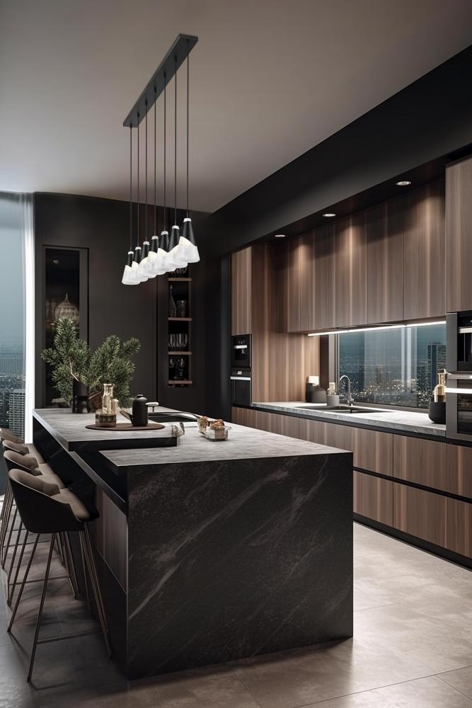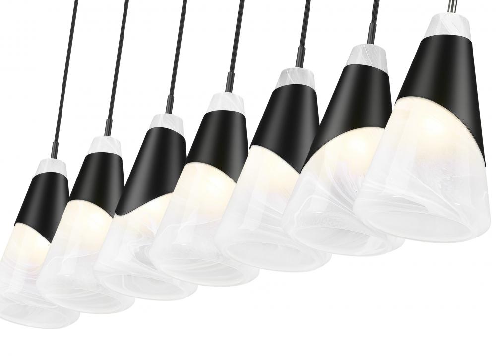 Upgrade your kitchen with the dynamic sophistication of this modern seven-light linear chandelier. Each pendant-style light suspends from a long, narrow canopy and black cord, offering a refined profile with a curvy metal shroud and conical artisan glass shade that delivers icy elegance. The fixtures matte black finish is clean and compelling, perfect for a timeless home.