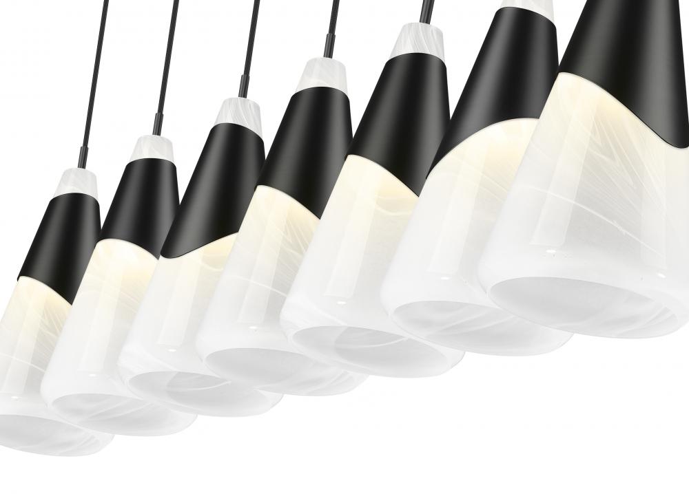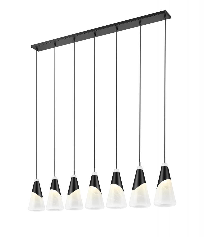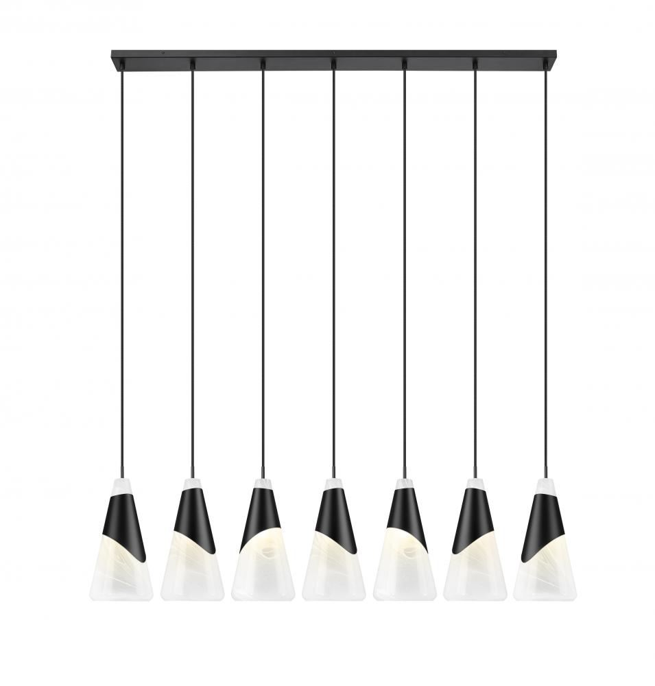 Icy elegance infuses sophisticated artistry into a modern seven-light linear chandelier. Shrouds in matte black create bold contrast against the swirled artisan glass, offers reduced glare and diffused illumination perfect for ambiance and tasks. A slender canopy and slim cords complete the design with clean precision.