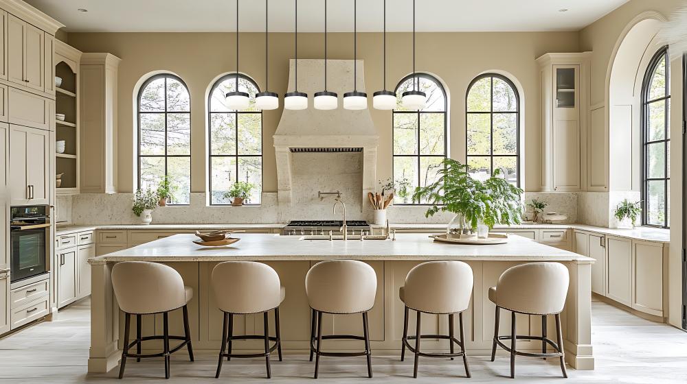 Stretched in a long, balanced line, this matte black 7-light linear LED chandelier spaces its clouded shades evenly so light reaches every seat along an extended island or table. The design feels substantial, while the slim cords and frosted glass keep the look airy and deliver strong illumination for cooking, working, and gathering. In open-concept layouts, it serves as a visual divider that gently defines the dining or prep zone while still allowing the rest of the space to flow around it.