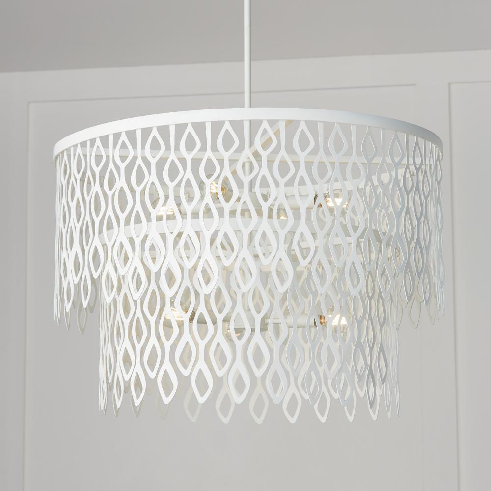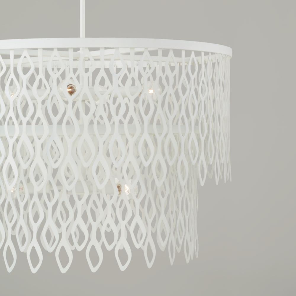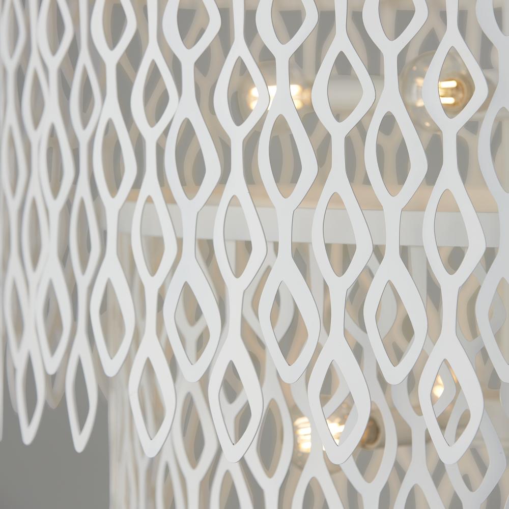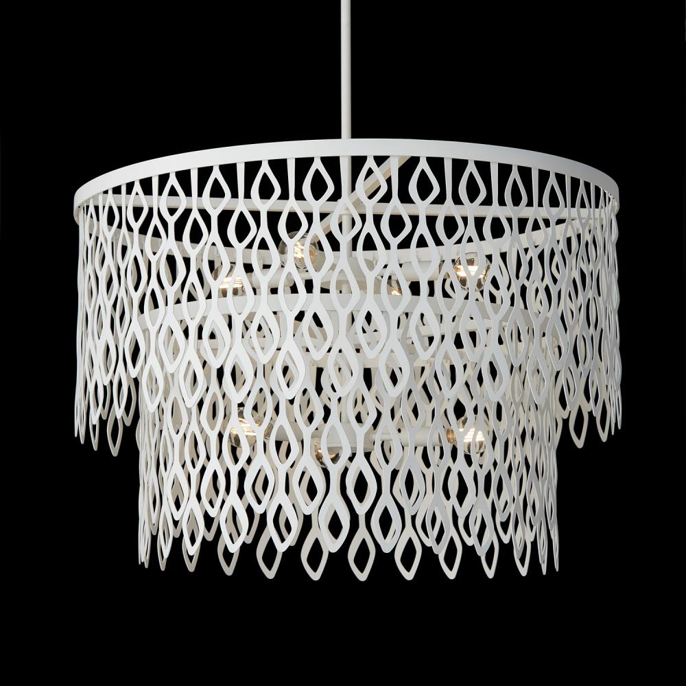 Invite modern glamour with the Matte White metal beauty of the Phoebe Pendant. With the two-tier design and cascading laser-cut motif, this luminaire evokes a layered lace-like effect that lights up from within.