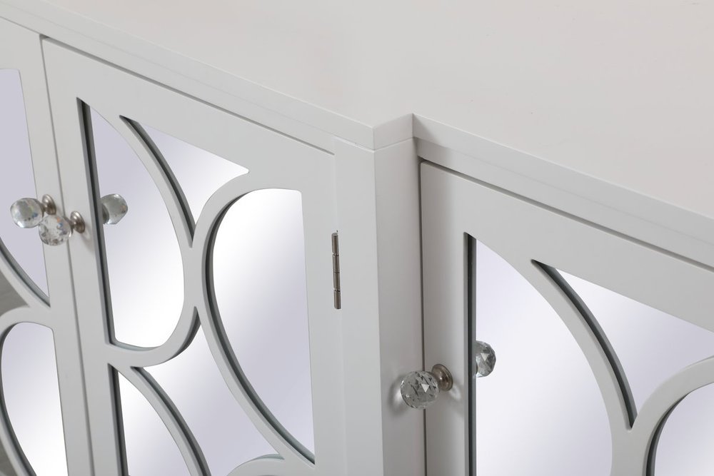 This white finish cabinet is demure luxury mixed with subtle charm. Delicate crystal knobs adorn the 4 cabinet doors, while the clear mirror panels, and the overlapping semi-circle design, adds a touch of glam and modern luxe. Whether a table lamp rests on the top, or you hide away trinkets within the storage space, this is the perfect accent to any room.
