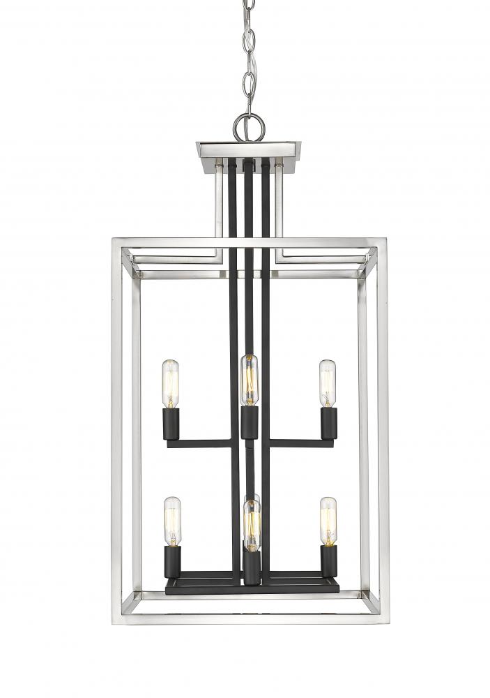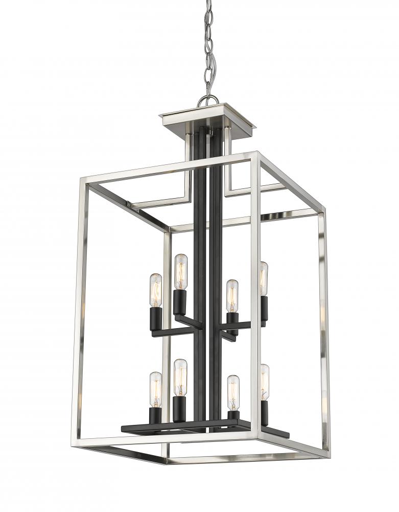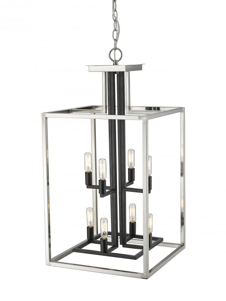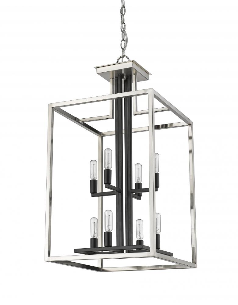 Let this tasteful eight-light chandelier add dimension and style to a contemporary space. Illuminating a dining ensemble or entryway, its geometric silhouette blends brushed nickel finish steel with black candelabra-style bulb bases arranged in an orderly fashion, creating a sleek, enticing effect.