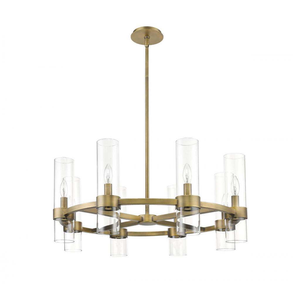 Distinctive modern style takes a page from industrial-inspired flavor, creating a captivating fixture blending polished rubbed brass finish steel and glass. With a circular spoke-style frame, the Datus eight-light chandelier lends a minimalist approach to lighting with enough glam to stand out. Perfect for a small- to mid-sized contemporary dining room, kitchen, or hallway, this chandelier delivers elegance with a round frame crafted of warm rubbed brass finish iron, dressed up with delicate clear glass cylinder shades.