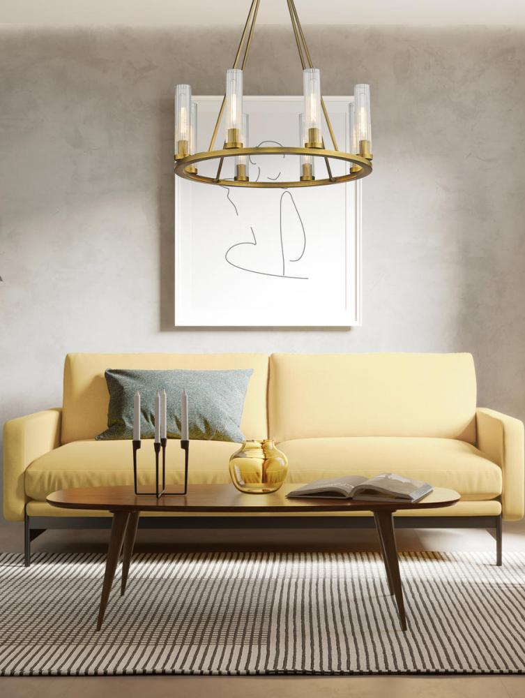 Make a modern statement in a dining room with this eight-light metal chandelier. With a sleek, round frame and textured glass shades, this rubbed brass fixture makes any dining room look effortlessly elegant.