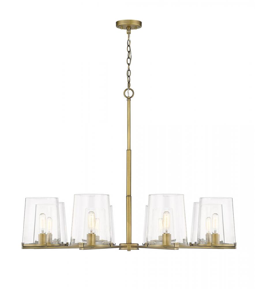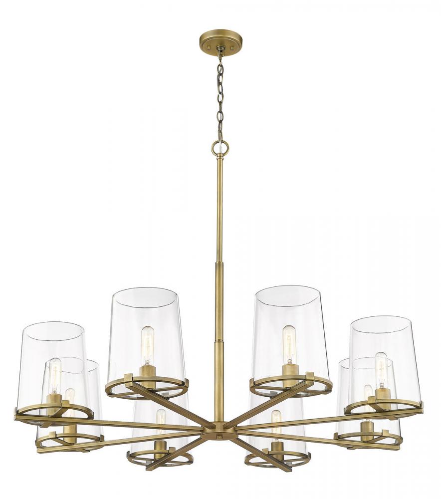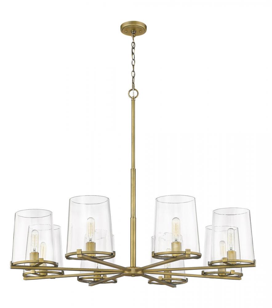 Create a warm and inviting dining room atmosphere with this eight-light metal chandelier. Eight tasteful, clear glass shades allow for bright illumination as the classic, rubbed brass finish shines in the light .