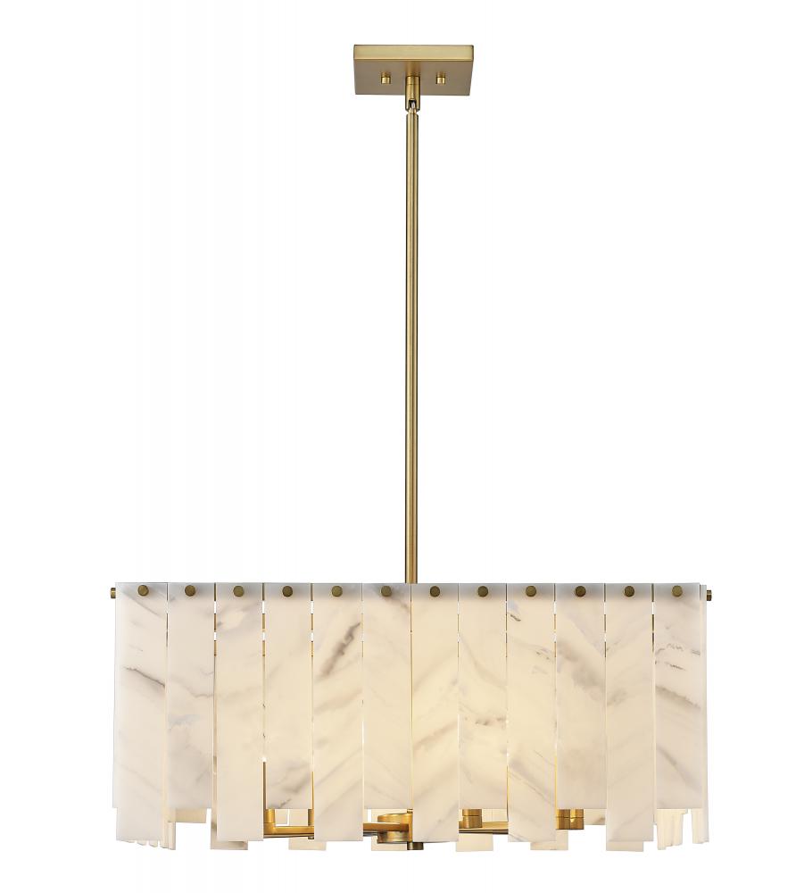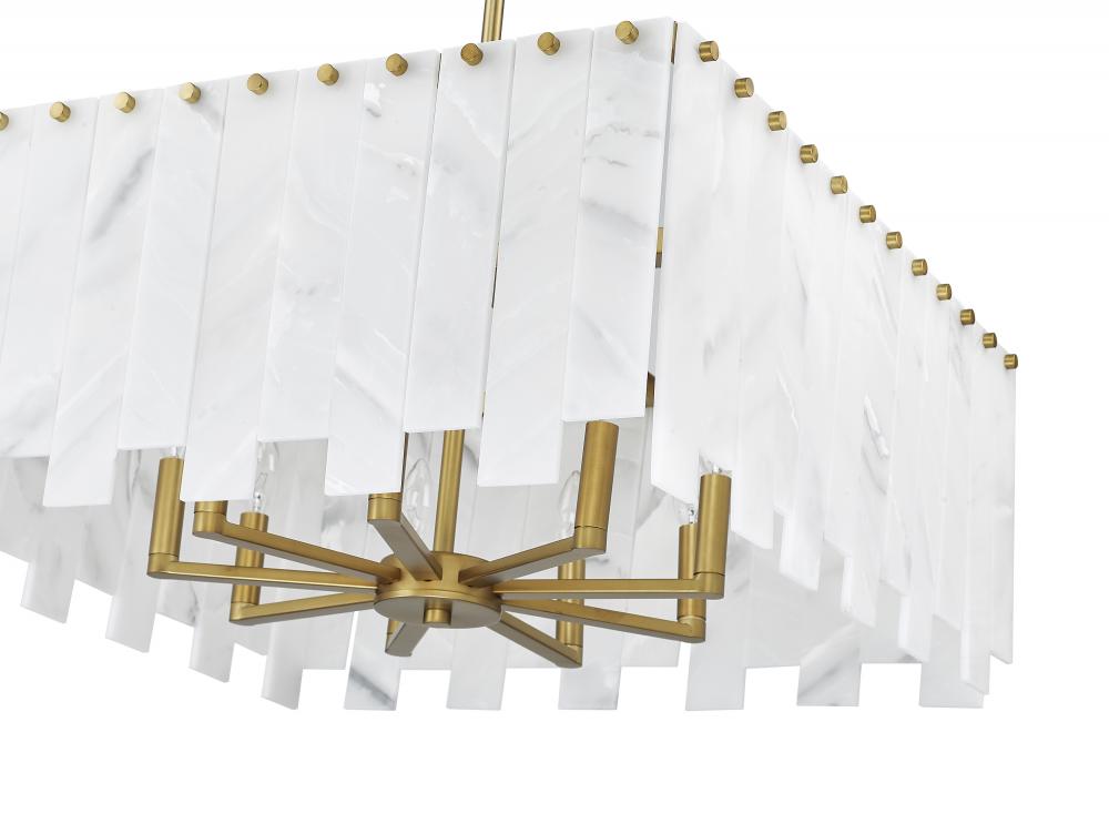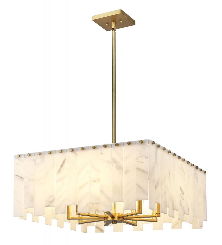 Prominent Art Deco influence pads the chic style of a fixture with an extraordinary aesthetic. Choose this decadent eight-light pendant from the Viviana collection to offer both easy palette elements and a chic look with alabaster-like strips alternating in length and arranged around a rectangular rubbed brass finish steel frame. Whimsical rivot detailing adds an industrial feel to this pendant that goes with the flow as it complements a gritty rendition of toned-down glam in a kitchen or entryway.