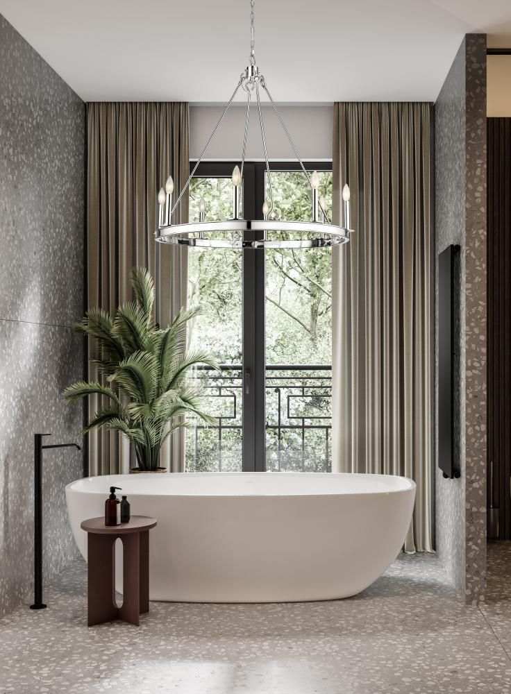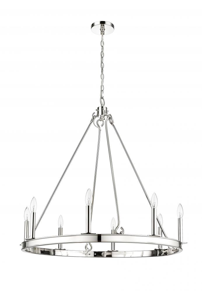 Committed to an extraordinary style impact, this traditional eight-light chandelier delivers on a theatrical motif with gleaming radiance. A classic ring silhouette features construction of polished nickel finish steel, adding versatility to its long list of attributes. Classic round silhouetting suggests a palace theme that speaks to sparkling expressive style in this chandelier offering charming, romantic candelabra bulb mounts.