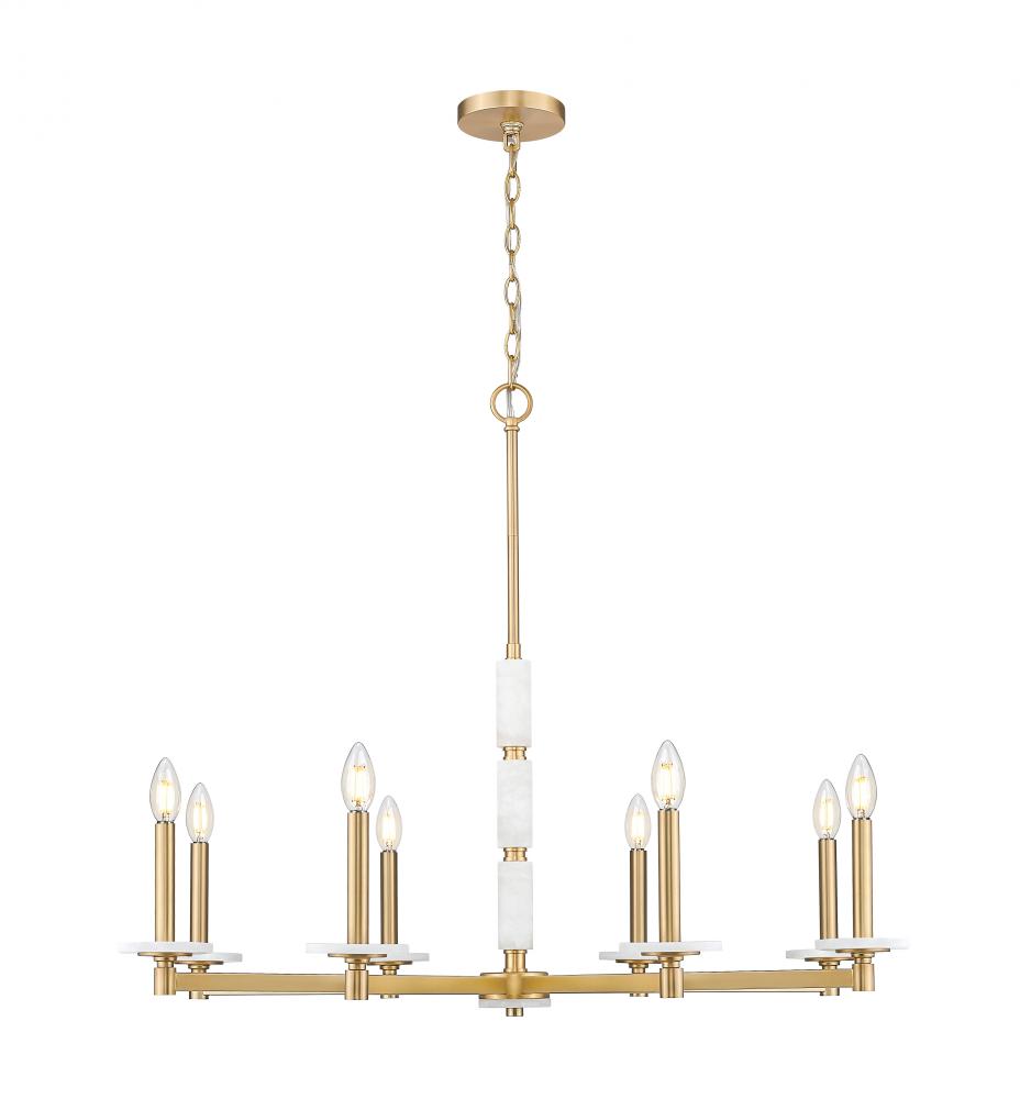 Looking for an effortless fusion of warmth, balance, and beauty? The modern gold frame of this stunning eight-light chandelier curves gracefully around eight alabaster spheres, each one glowing with a natural, calming light. It brings softness to high ceilings and a golden tone to every gathering.