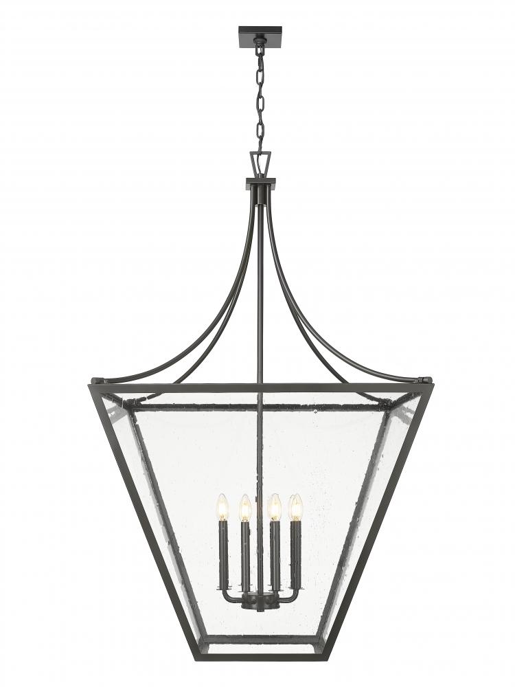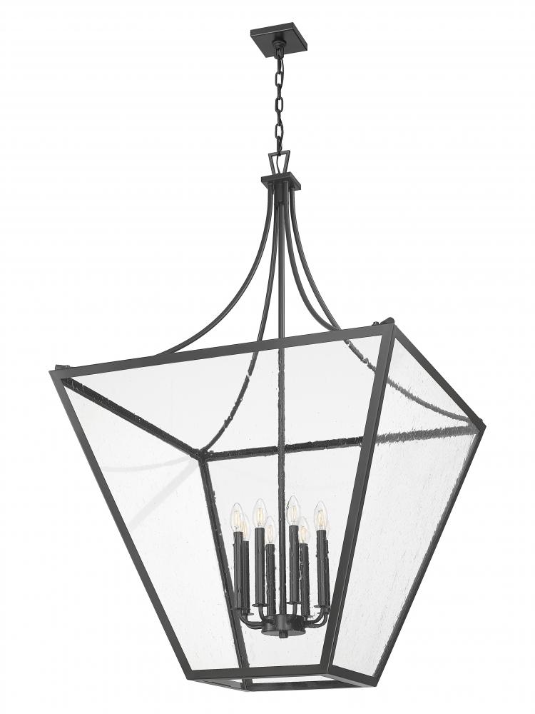 Illuminate an entire open space with a charming eight-light chandelier designed with an iteration of the lantern motif. Iron ore finish steel framing creates an inverted pyramid, tent-like silhouette, as slightly seedy glass panels reveal a cluster of candelabra-style bulb mounts. This fixture is dimmable to adjust light levels as desired.