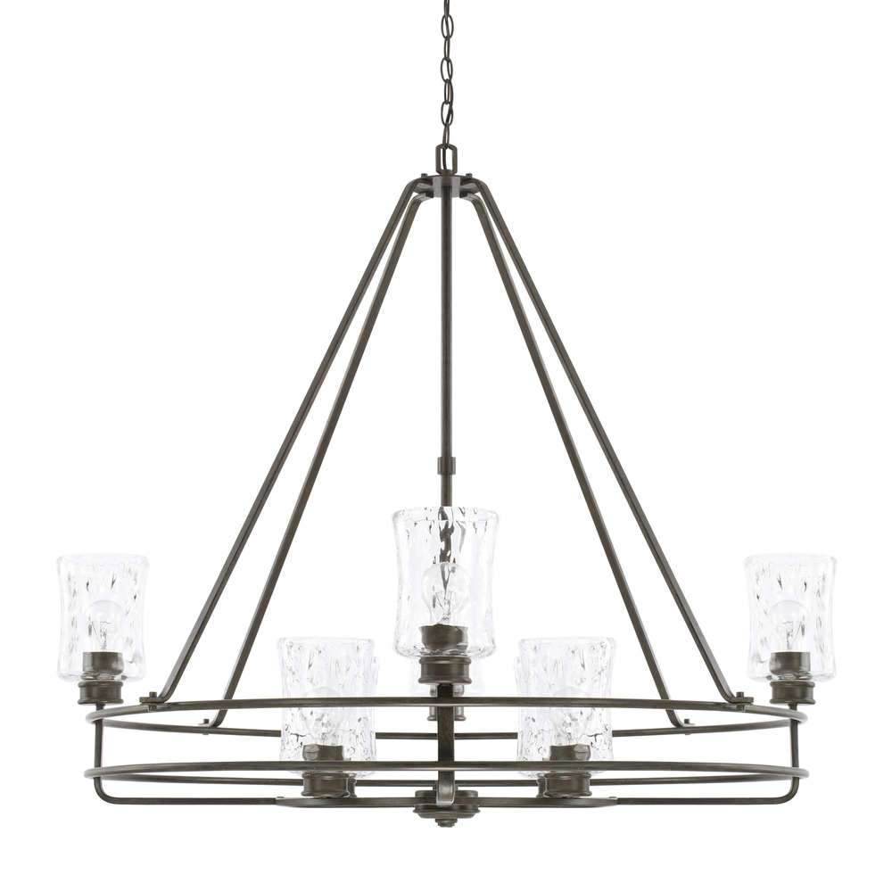 The Bristol 8-light large chandelier channels modern farmhouse style with a gridded frame fashioned after a rustic basket. Clear Water glass shades arranged in a tiered configuration soften the lines, lending visual and textural contrast. Speaking to industrial farmhouse, rustic contemporary and vintage-inspired aesthetics, this light fixture is designed to be the centerpiece of a kitchen, living room or dining room.