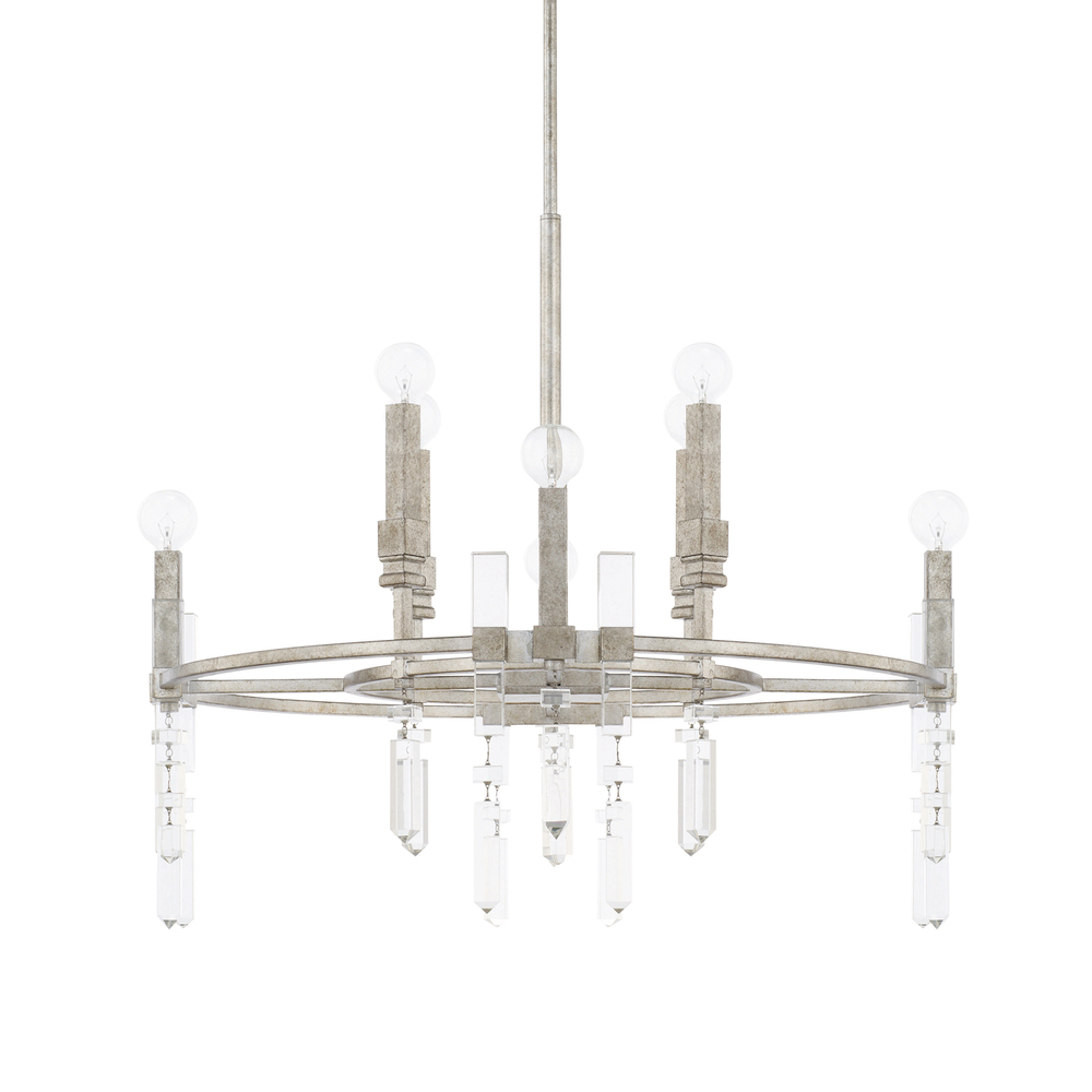 The Drake 8-light chandelier offers a glammed-up take on mid-century modern style with geometric elements, crystal adornments and an Antique Silver finish. Nestled in the frame are sleek K9 crystals that mimic the square columns rising up from the ring. Sculpturally inspired with a fresh aesthetic, the Drake chandelier is all set to dazzle in an updated living room or dining room.