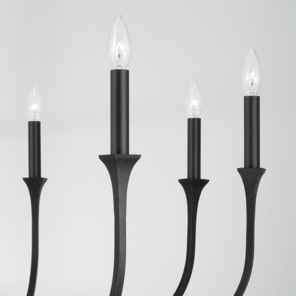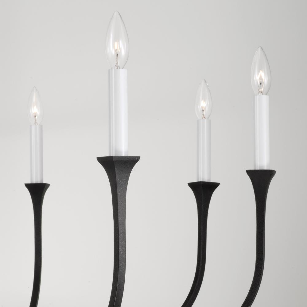 A timeless luminaire, the Decklan 8-Light Chandelier offers elegance with options. The textured Black Iron arms curve upward into flared bases for interchangeable candle sleeves – with both Matte White and Black Iron finishes included – to create tailored style in any space.