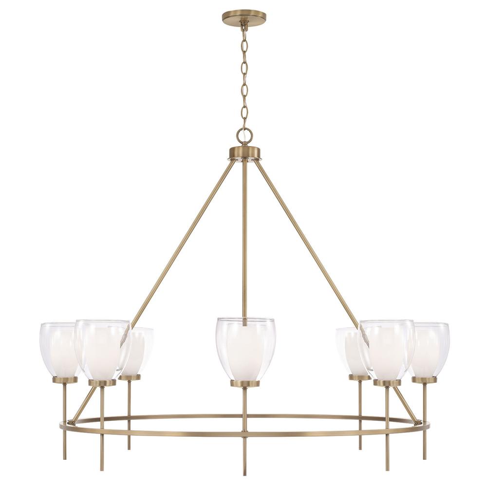 DETAILS: Layered Soft White and Clear glass create glamour and intrigue, while the Aged Brass finish offers a warm, refined shine.