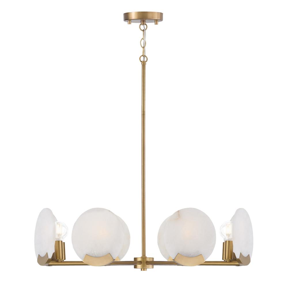 Handcrafted with natural Alabaster stone, the Oriya Small Chandelier delivers modern sophistication with organic appeal. Held by a curved base, each Alabaster disc offers a naturally unique illumination, while the Aged Brass finish creates a classic elegance.