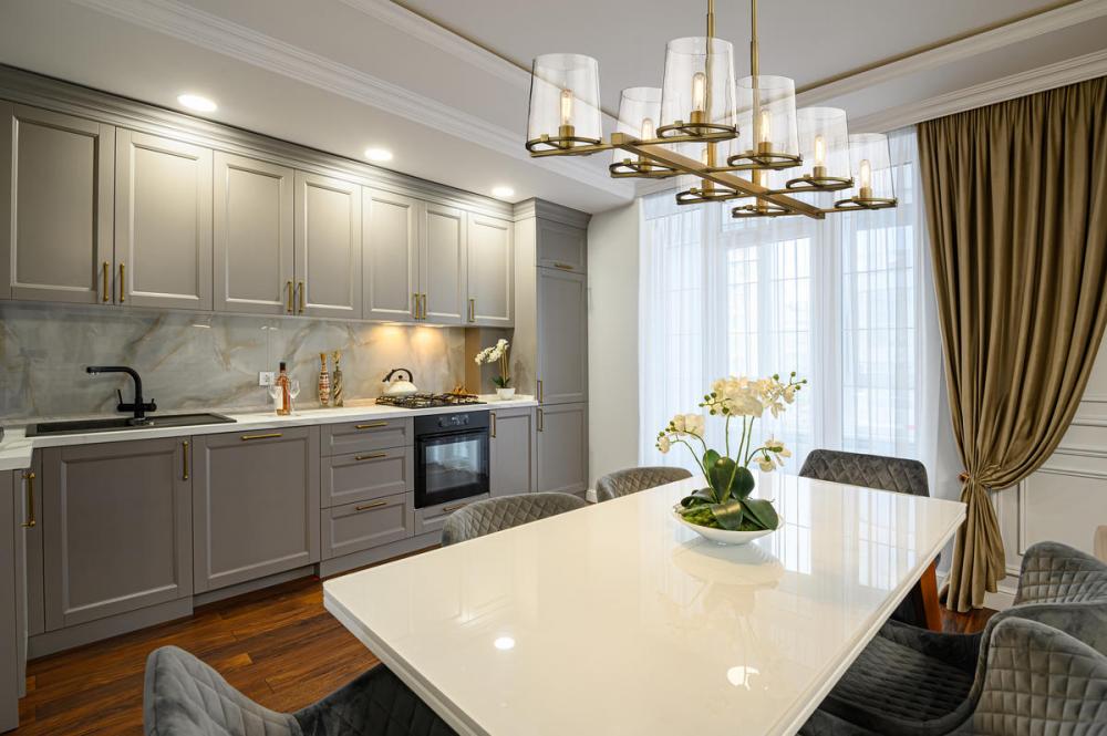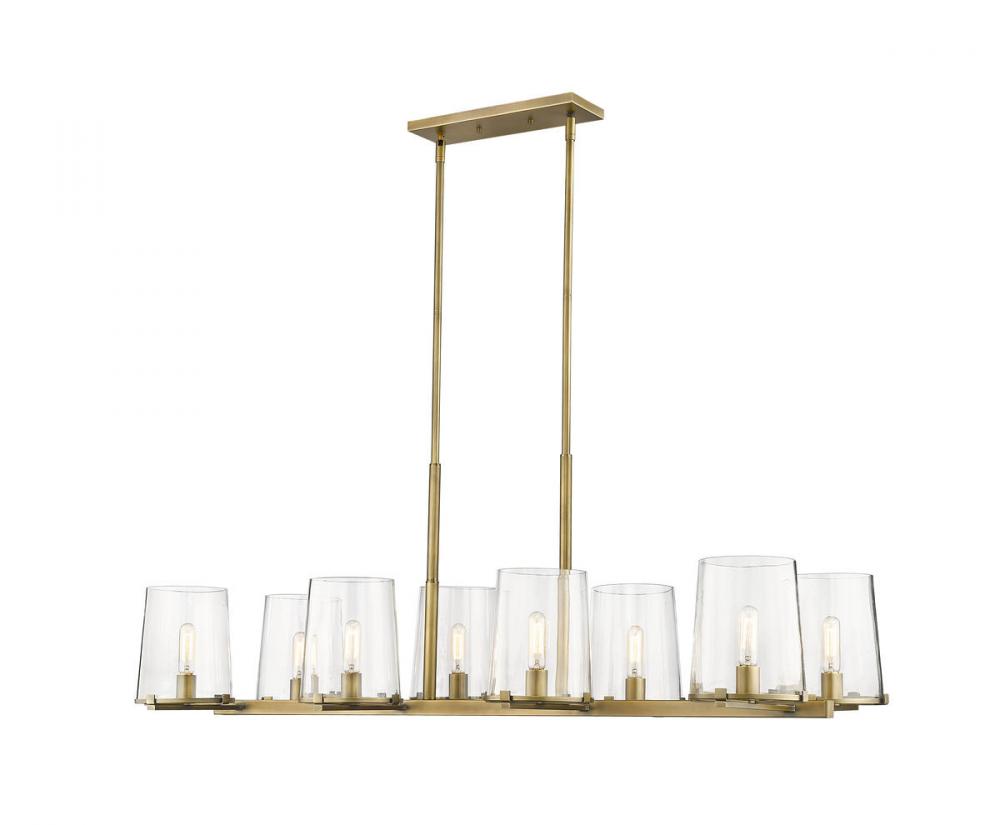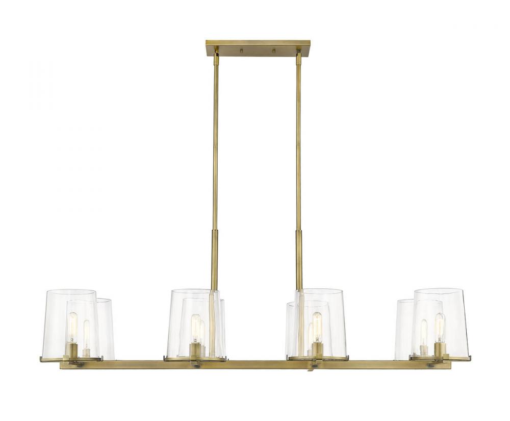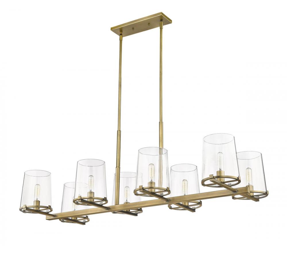 Update a kitchen or recreation room in effortless, modern style. Ideal for a modern or transitional d?cor scheme, this rubbed brass island light brightens a room with eight glowing lights beneath classic, clear glass shades.