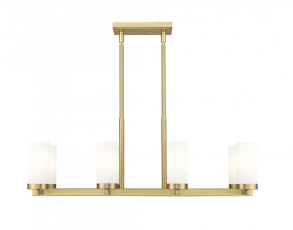 Bring cohesive style over a kitchen island with a modern eight-light linear chandelier in a rich, sophisticated modern gold finish. Beautifully simple in design, it showcases a streamlined rectangular silhouette studded with frosted white glass shades for diffused, inviting illumination for everything from entertaining to daily living.