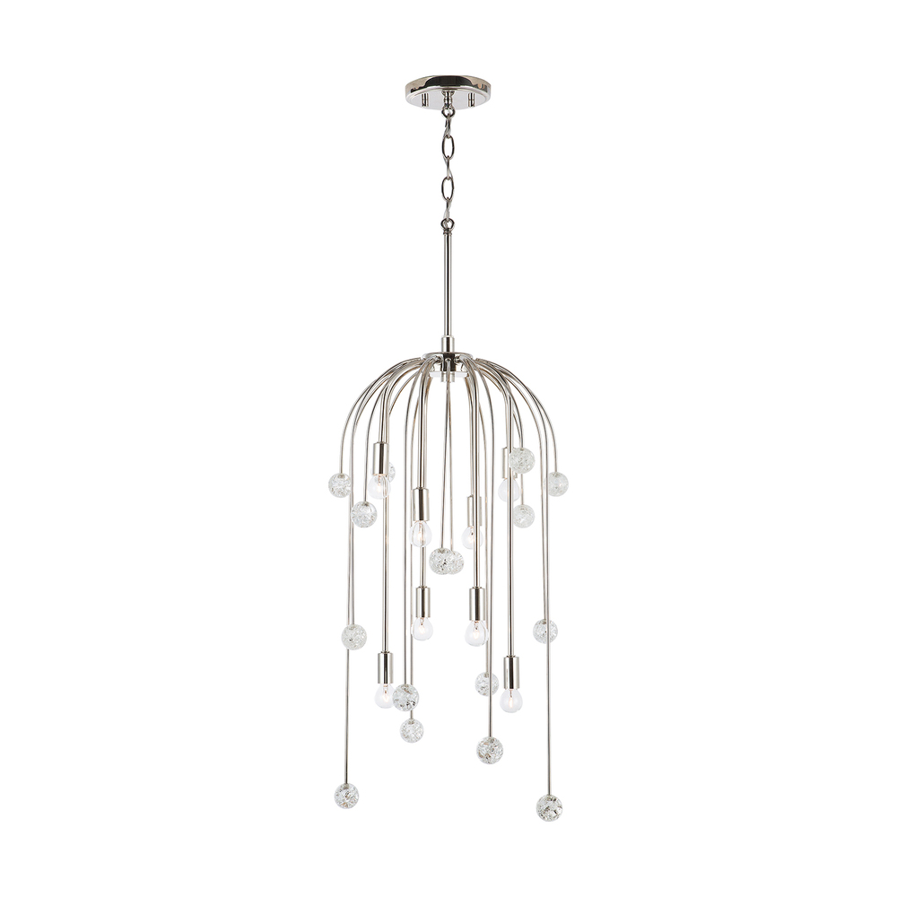 8 light pendant with Polished Nickel finish. Handcrafted Crackled Glass Adornments.
