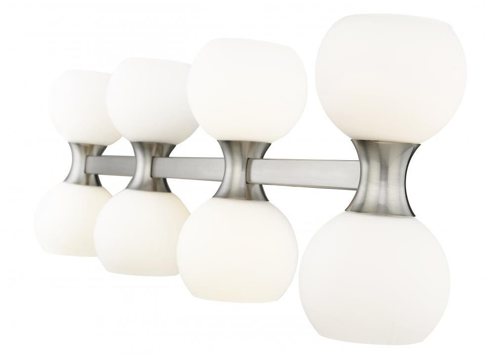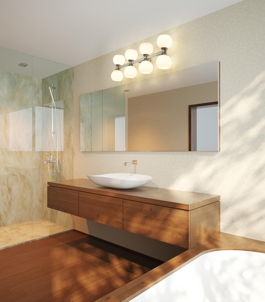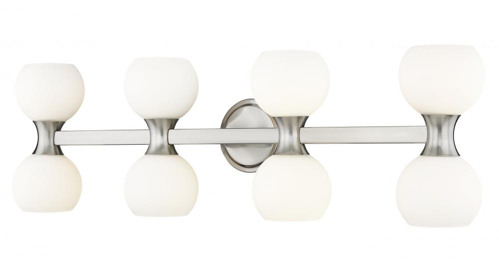 Embellishing a custom ensuite or guest bath space is a breeze when iconic Mid-Century Modern style and Art Deco attitude blend to produce a hit. This eight-light vanity light from the Artemis collection checks all the boxes for a compelling design and solid ambient uplighting and downlighting infused by matte opal glass open globes. Linear sensibility joins alluring curves in a sleek brushed nickel finish steel frame, wrapping up a host of decadent features.