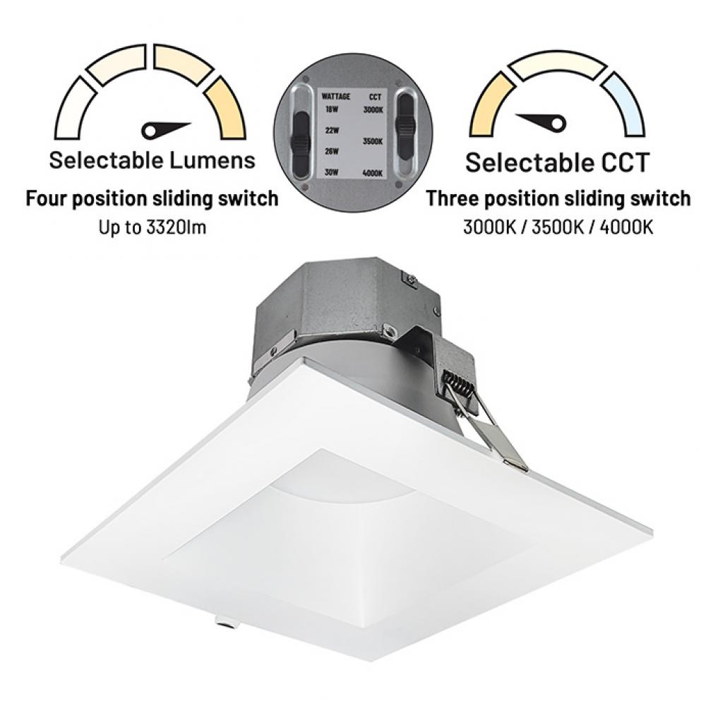 Lumens / Wattage: Selectable Lumens (2050lm / 18W; 2450lm / 22W; 2900lm / 26W; 3300lm / 30W)
