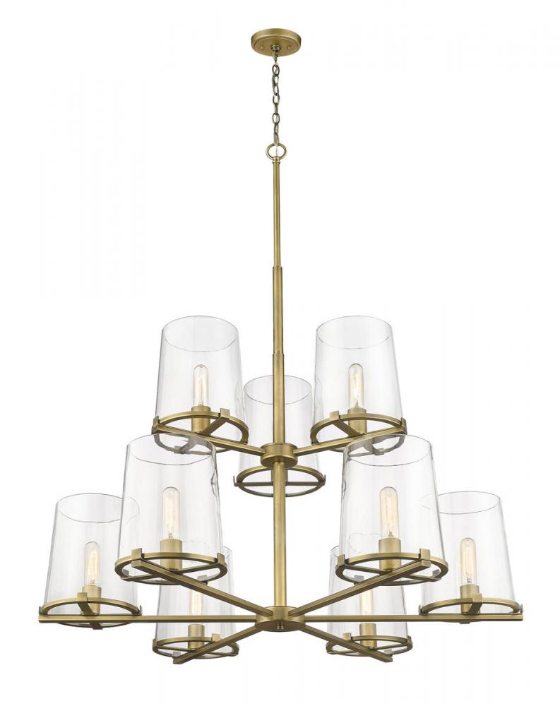 With two tiers of tasteful, tapered clear glass shades, this nine-light metal chandelier is a commanding presence in a dining room. Its sleek, steel frame is treated to a classic, rubbed brass finish for a design that effortlessly complements a transitional decor aesthetic.
