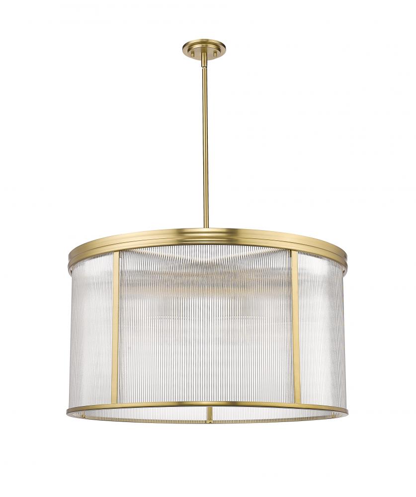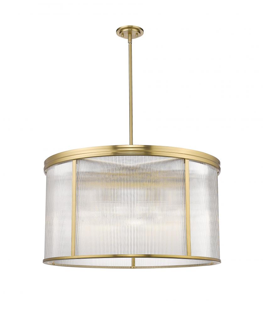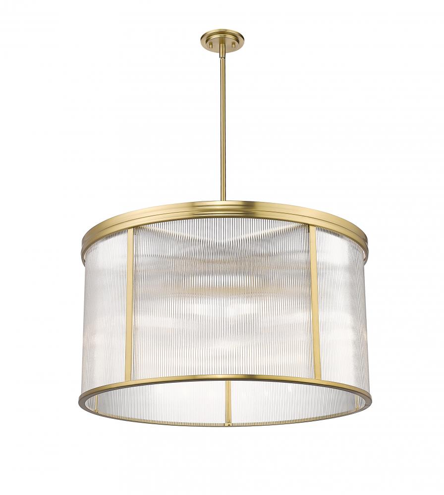 Modern energy infuses the timeless profile and warm modern gold finish of a chic nine-light chandelier. Gorgeous centered over a dining table or living room sitting area, the chandelier pairs the soothing elegance of a drum silhouette with the character and textural dimension of architectural ribbed glass, creating a sum greater than its parts. Its the perfect upgrade over a welcoming dining table or beautiful foyer.