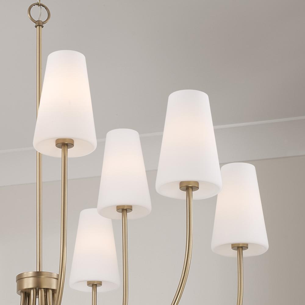 DETAILS: Elongated Soft White glass shades and sleek Aged Brass details bring an elegant aesthetic to the large-scale silhouette.