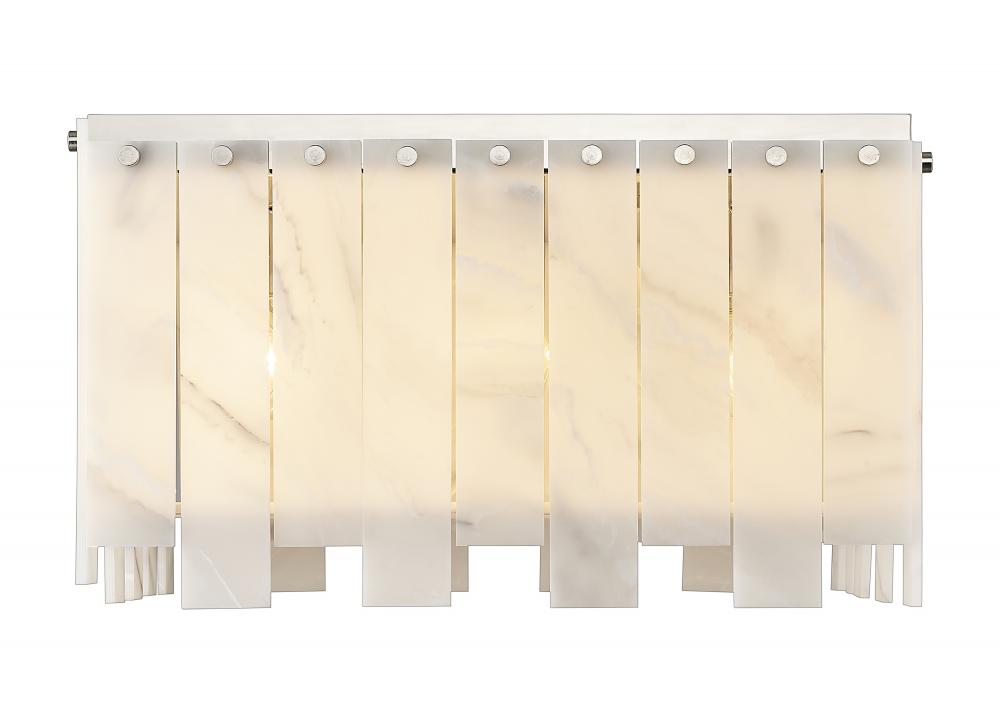 Creating a striking look of surprising simplicity merged with Art Deco gallery style, this nine-light flush mount ceiling light from the Viviana collection creates impact with alabaster-like strips alternating in length and arranged around a rectangular polished nickel finish steel frame. Whimsical rivot detailing adds an industrial feel to this flush mount light that goes with the flow as it complements a gritty rendition of toned-down glam in a kitchen or entryway.