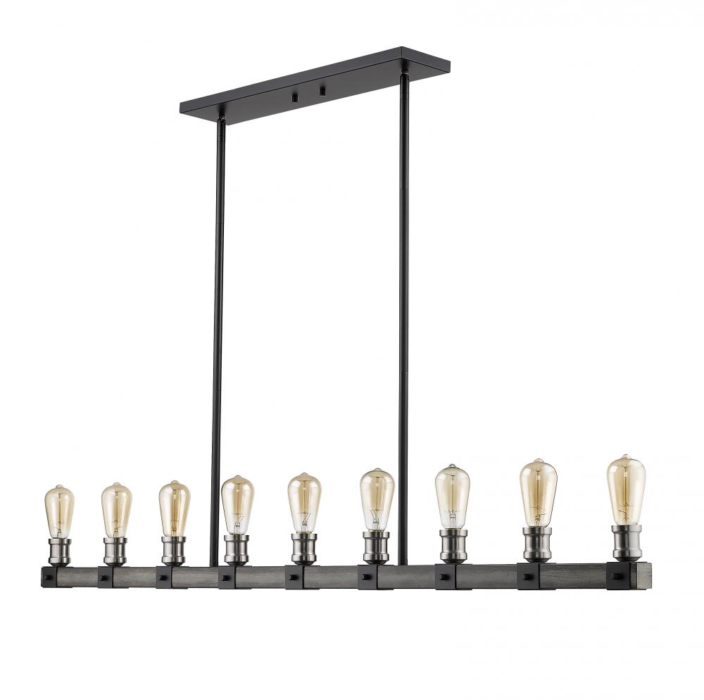 Shine brilliance in a kitchen or dining room with the elongated shape of this nine-light pendant light. The sleek silhouette showcases faux barnwood and barnboard in a distressed ashen hue, complete with industrial exposed lightbulbs.