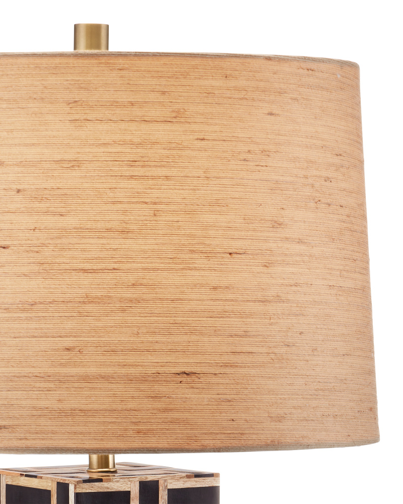 The Aarna Black Table Lamp, with its basketweave pattern, is made of pieces of wood interspersed with strips of black composite. The contrast of the textural woodgrains and the sleek composite creates an interesting aspect to this design, as do the angular lines of the rectangular body that echo the scale of the elongated pieces on its surface. The drum shade contributes to the feeling of complexity that is obvious with this design.