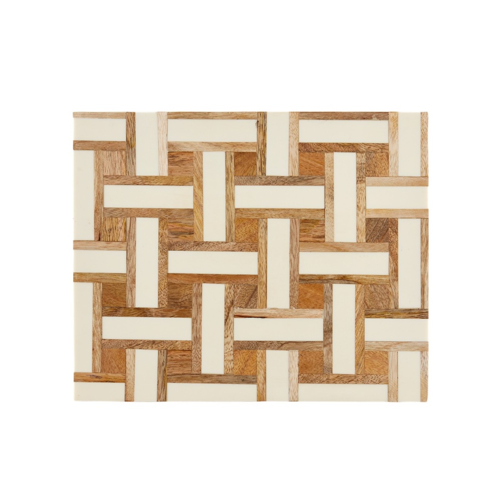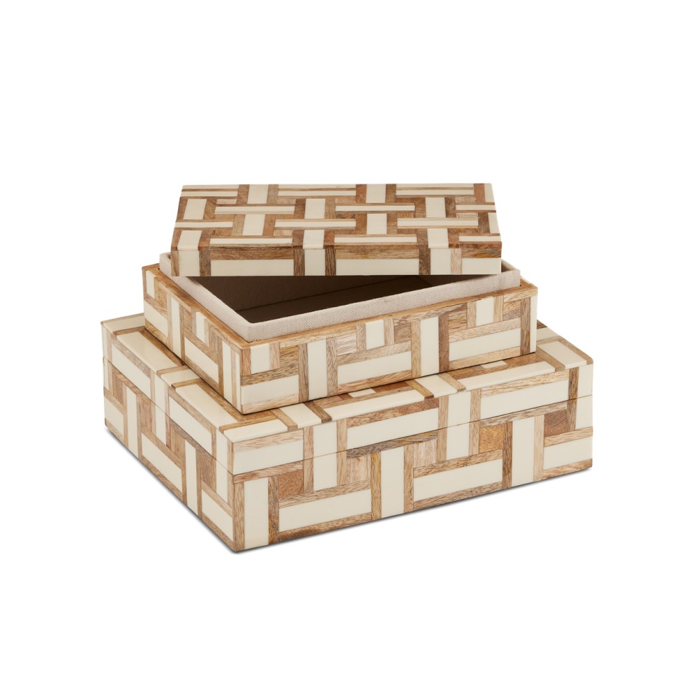 The Aarna Cream Box Set with its basket-weave pattern is made of pieces of wood interspersed with strips of ivory composite. The contrast of the textural woodgrains and the sleek composite creates such an interesting aspect to this design, as does the angular lines of the overall rectangular shapes that echo the elongated pieces on their surfaces. The interiors of the boxes are lined in white linen.