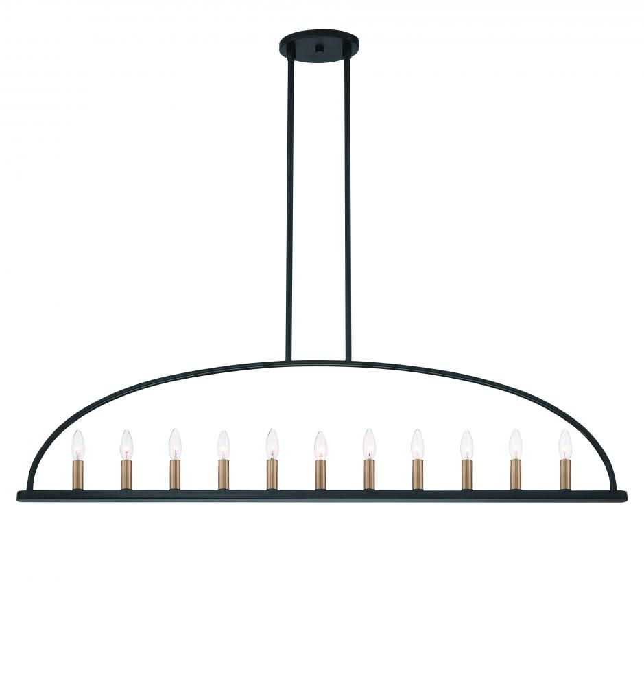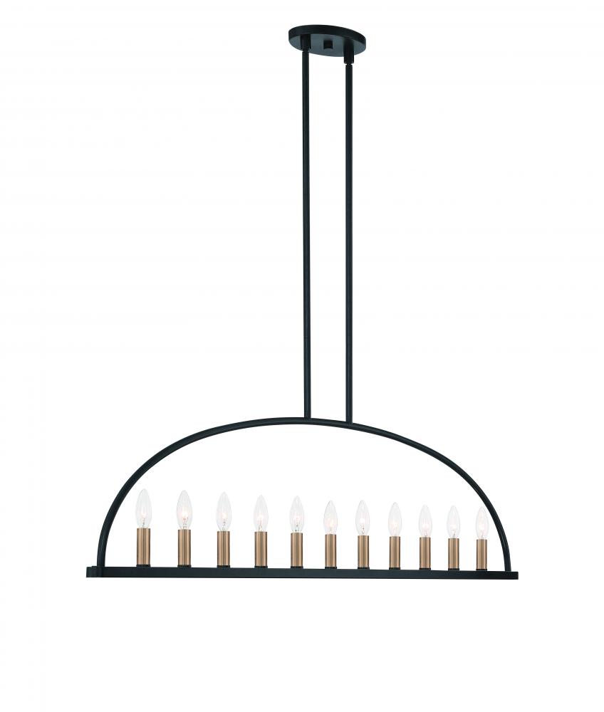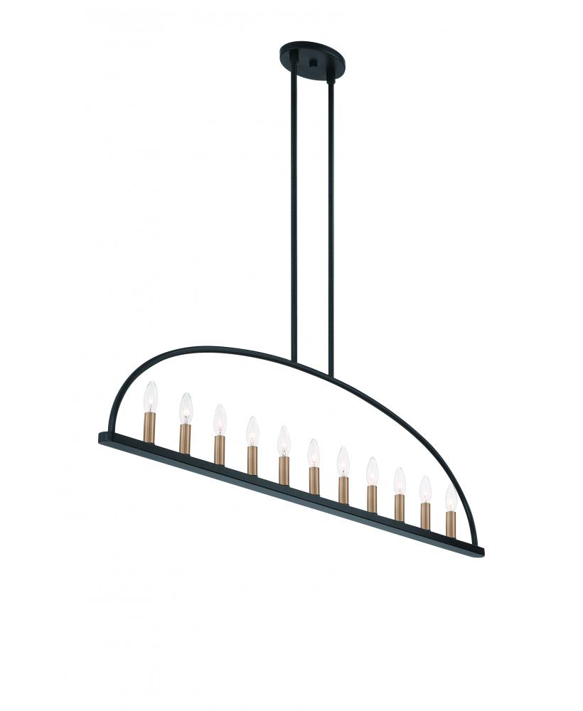 The Abbott linear chandelier presents a simple, streamlined shape and clean lines. The open-concept frame features a metal arch and a sleek, narrow rod with a series of thin bulbs. Mounted above an island or over a dining room table, this fixture appeals to a minimalist sense of style and comes with both white and gold candle sleeves. The Abbott comes in vibrant gold and black finish.