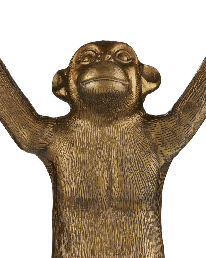 Inspired by a previous whimsical design that has been extremely popular, the Abu Gold Planter with its seated ape, molded in cast aluminum, lifts a plant-worthy vessel with little effort. The antique gold finish that covers the piece makes the gold planter read as if it has aged. The texture that is inherent in metal poured into molds in a foundry is evident on this piece, which brings it a vintage flair. It is best to use a liner with the solid metal planter when a planter has a drain hole.
