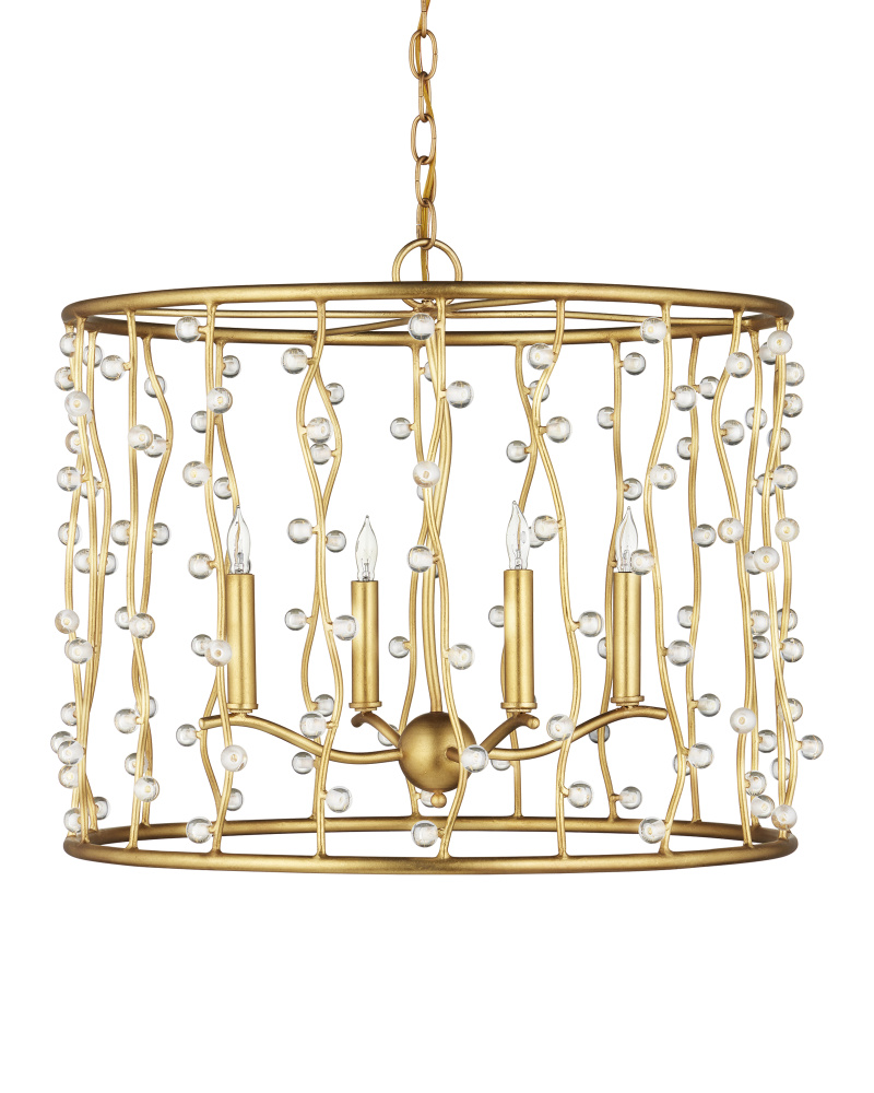 The Adagio Chandelier is a gold chandelier that adroitly holds its crystal beads, which are affixed to wavy metal wires that flow between the top and bottom rings on tiny barbs. The pieces of crystal are prone to glow even when the lights are not switched on, as is the brilliant contemporary gold leaf finish on the metal. Adjustable from 25.25" to 93.25" with use of included chain/rod kit/cable. If your space calls for a longer drop, additional chain/rods/cable is available for purchase.