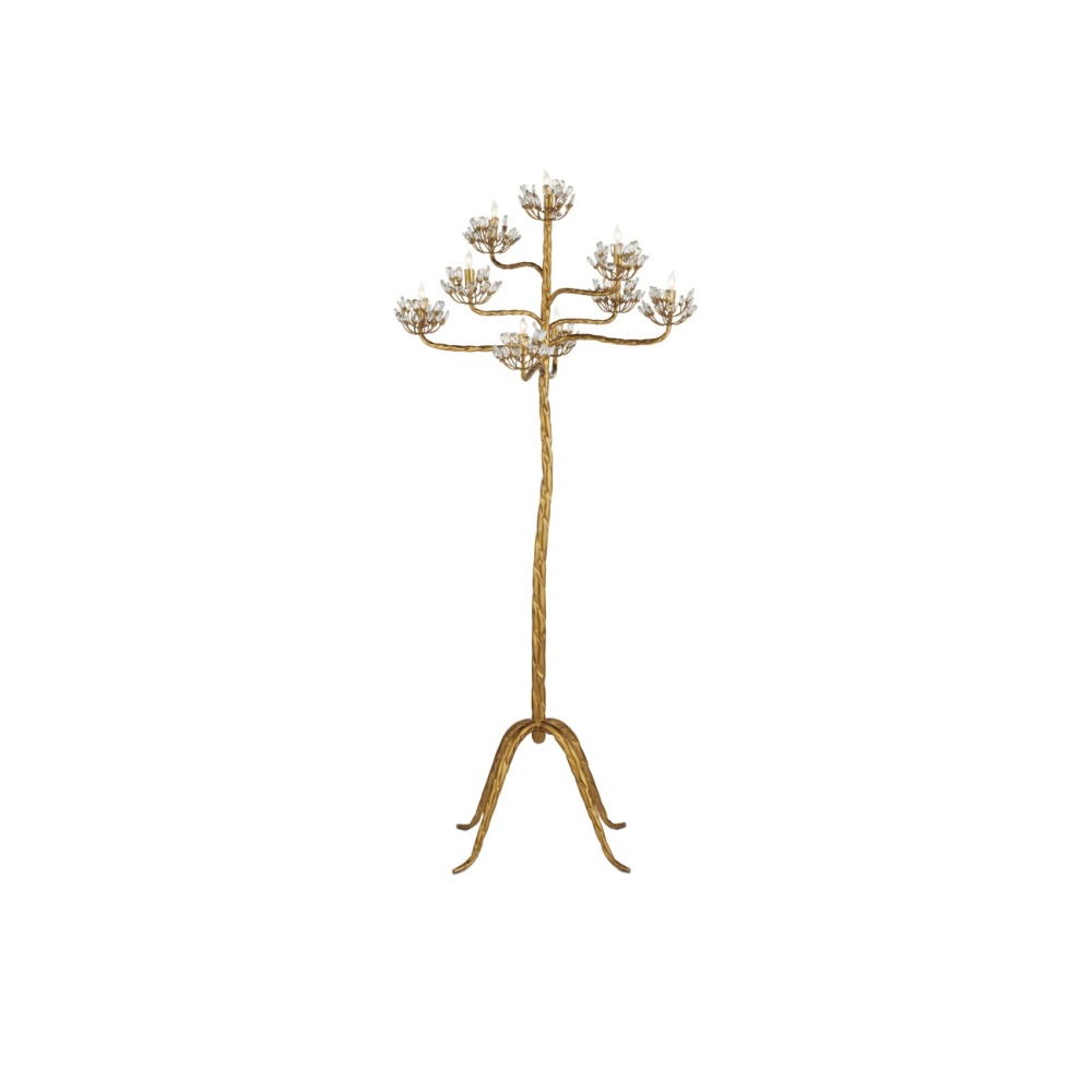 The Agave Americana Floor Candelabra is a grand piece inspired by the Century plant of the American desert. Nine lights are surrounded by clusters of faceted crystals fitted to branches of hand-forged metal tubes in a contemporary gold leaf finish. The gold floor lamp is in our Marjorie Skouras Collection.