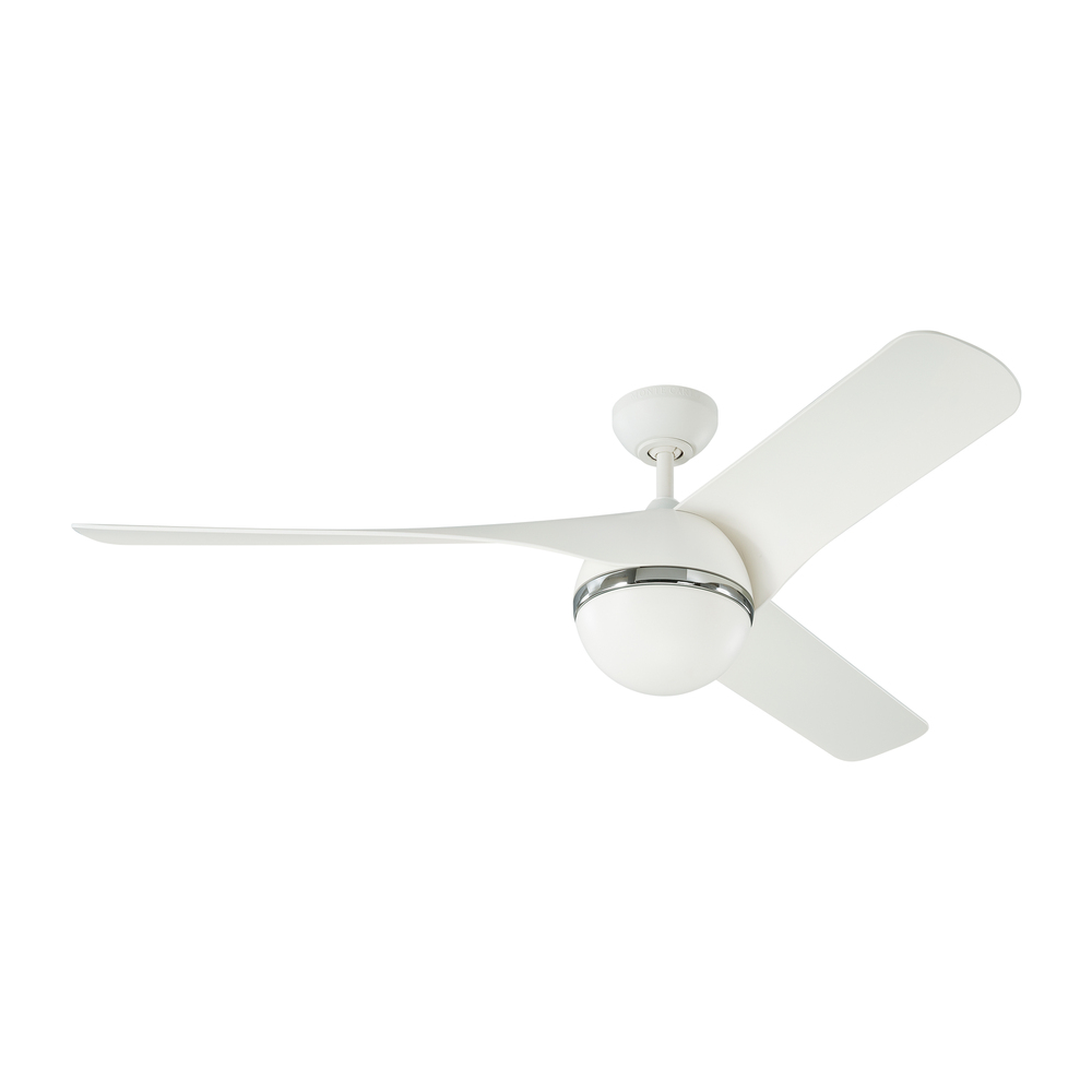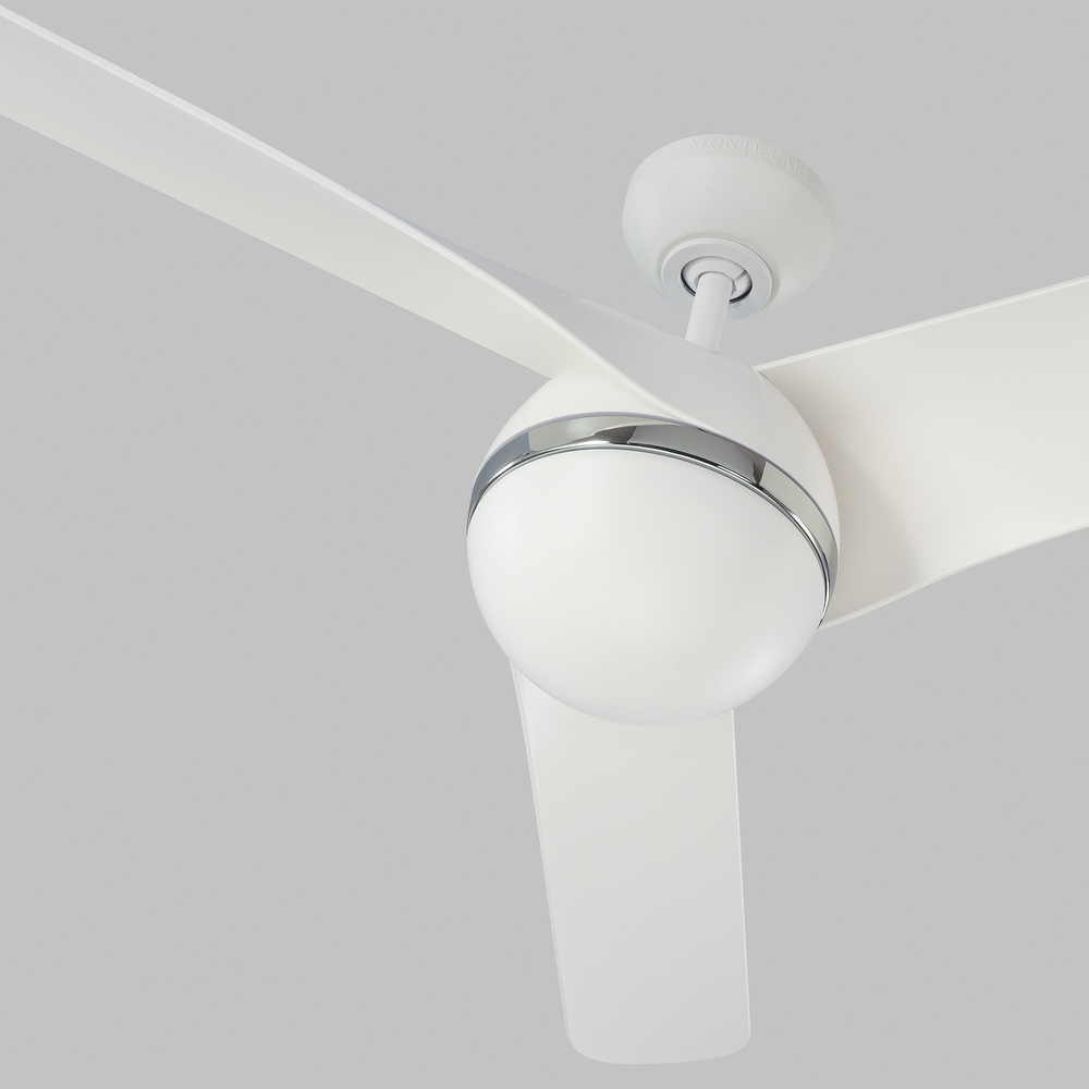 The Monte Carlo 56 Akova - Matte White In Matte White Features A 125.0 X 20.0 6 Speed Motor With A Seventeen Degree Blade Pitch. The Subtle Centric Curves In The Three Overlapping Blades Of The Akova Led Ceiling Fan By Monte Carlo Take Modern Form And Function To New Expressions. Akova Led Offers An Interlacing Swirl Of Motion In The 56 Blades And A 20W Integrated Led Downlight Delivering 1600 Lumens Of Output. Akova Is Reversible, Comes With A Handheld Remote To Switch Between The Three Speeds And Has Three Distinctive Finish Options That Match On Both Body And Blade: Matte White, Matte Black And Chrome. Akova Led Is Damp-Rated.