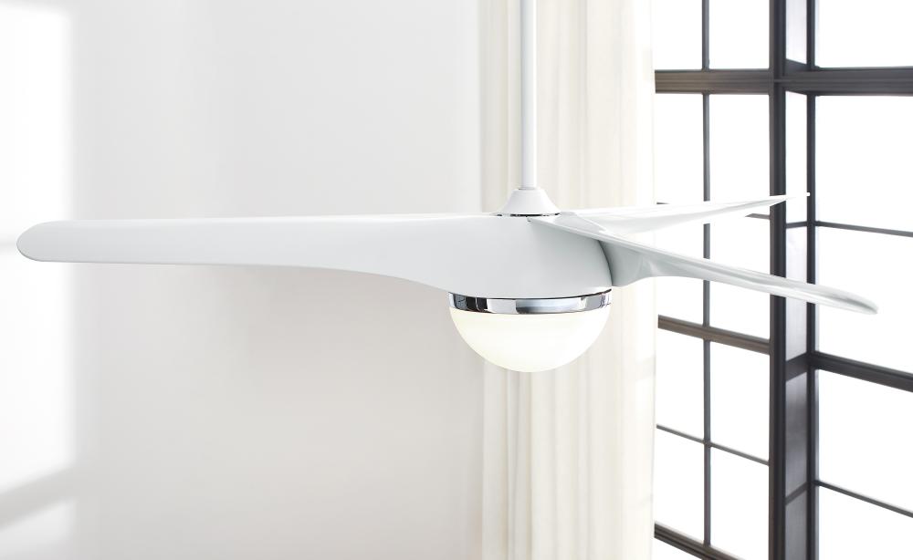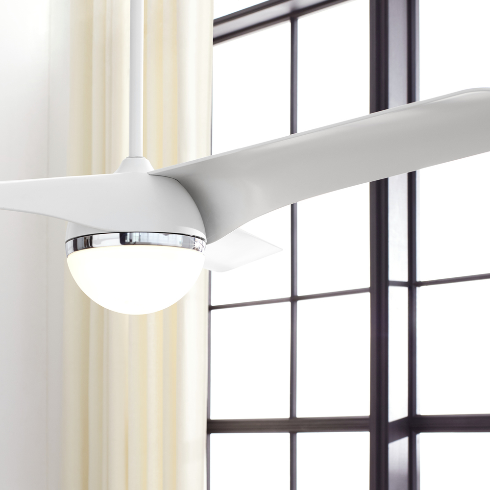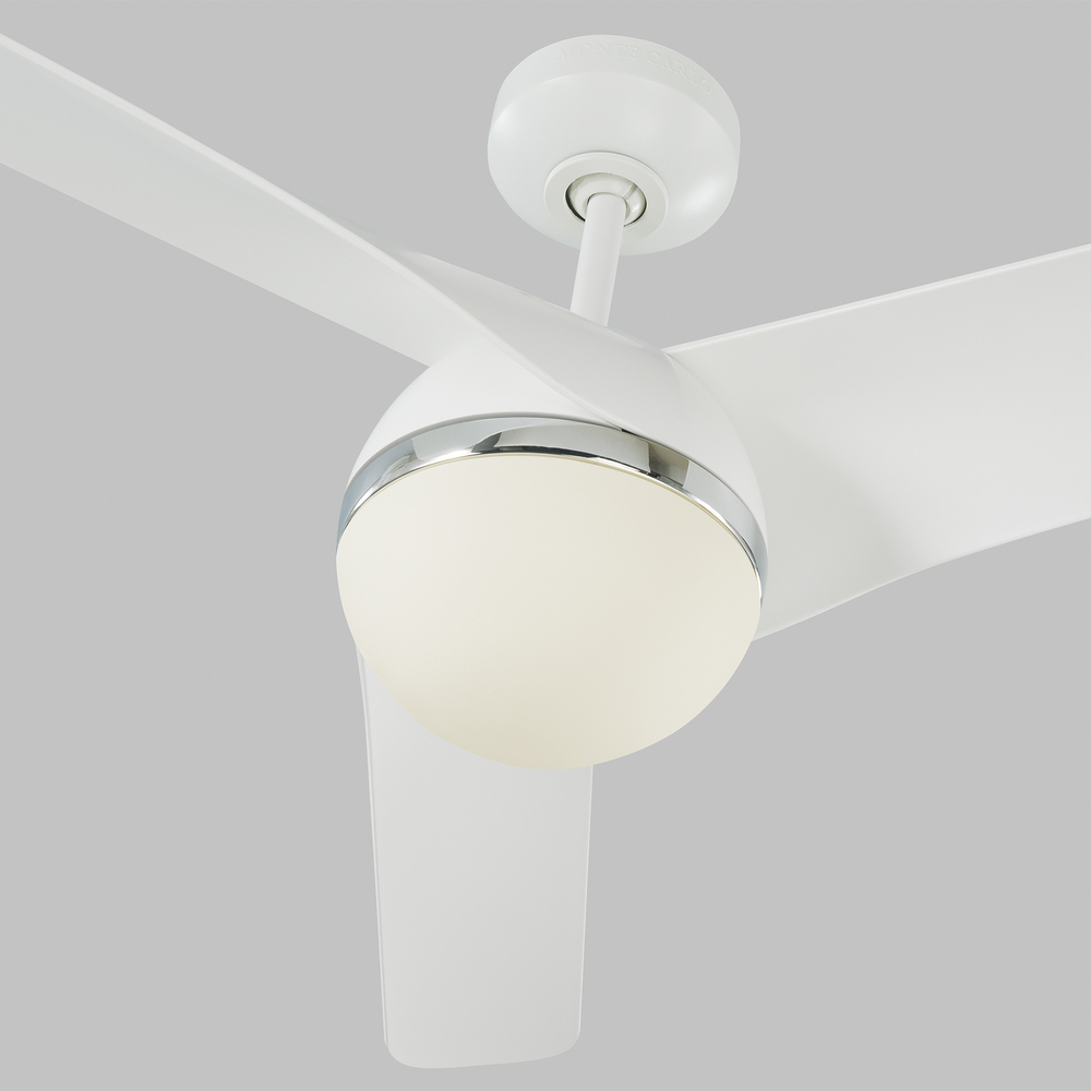 The Akova 56 LED in Matte White features a 125.0 X 20.0 6-speed motor with a Seventeen-degree blade pitch. The subtle centric curves in the three overlapping blades of the Akova LED ceiling fan take modern form and function to new expressions. Akova LED offers an interlacing swirl of motion in the 56" blades and a 20W integrated LED downlight delivering 1600 lumens of output. Akova is reversible, comes with a handheld remote to switch between the three speeds, and has three distinctive finish options on both body and blade: Matte White and Matte Black. Akova LED is damp-rated.