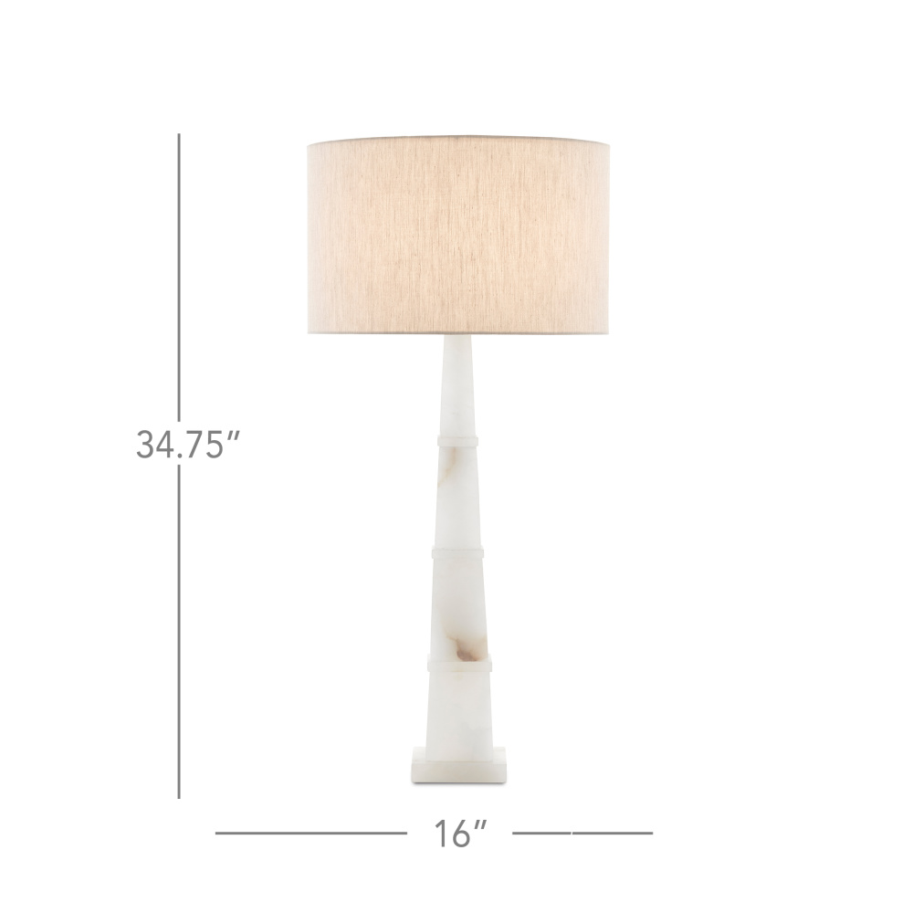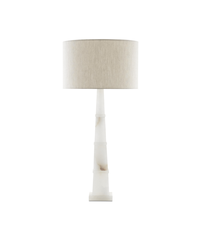 Stacked alabaster creates an obelisk shape to make our Alabastro Table Lamp luxurious. This simply elegant shape in translucent stone is beautifully veined. The white marble lamp is topped with a natural linen shade.