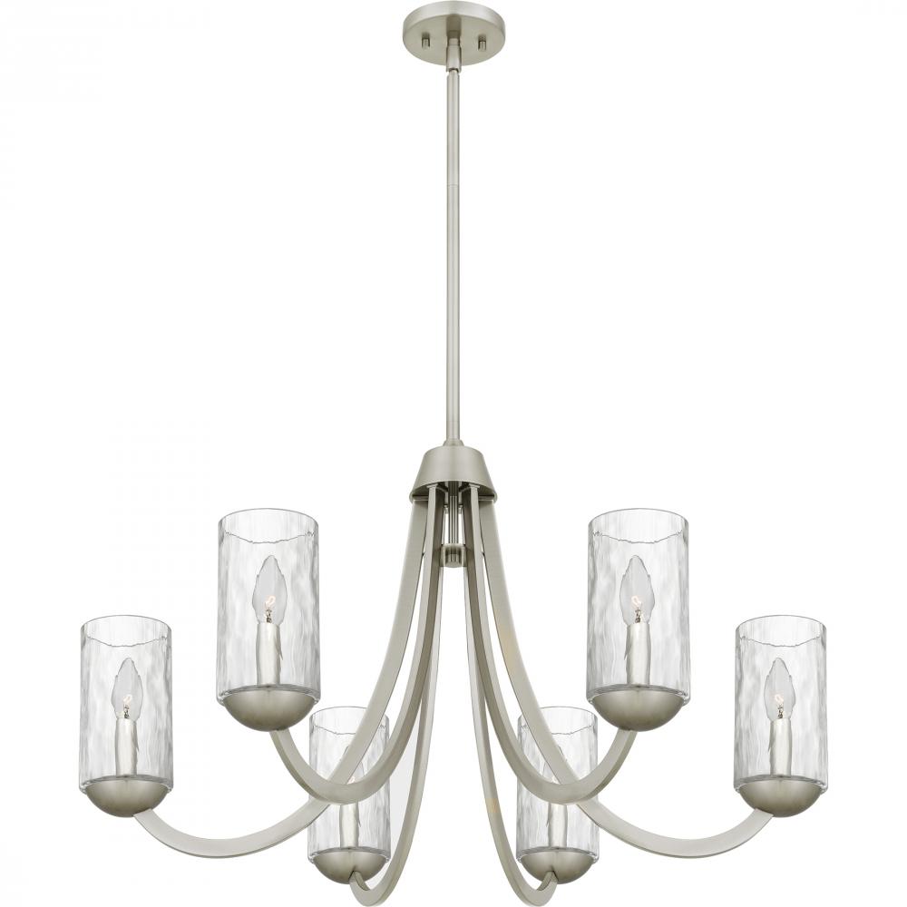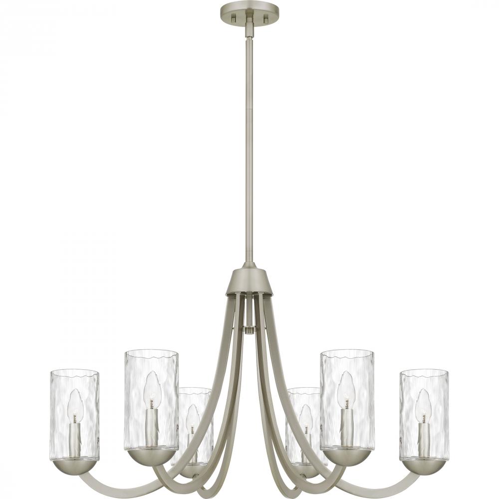 The Allard chandelier is a stunning centerpiece that commands attention. Clear water glass shades add a touch of sophistication and allow the light to shine through brilliantly. Choose from two sizes of chandelier in either matte black or brushed nickel to