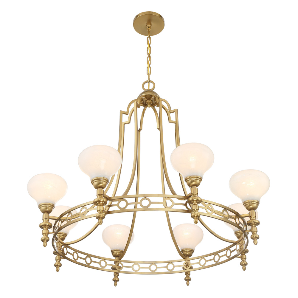Discover boundless vintage charm from top to bottom with the Savoy House Allston 8-light chandelier! Eye-catching features like turned detailing on the bobeches, a circular pattern on the hoop and Art Deco style arms are sure to please. Bulbous shades of white strie glass showcase mesmerizing, spectacular swirls and pair perfectly with the Warm Brass finish. Allston is 32.625" in height and 36" in width. It uses eight standard size bulbs of up to 60 watts per bulb. Bulbs not included. Comes with 120" of chain and 144" of cord.