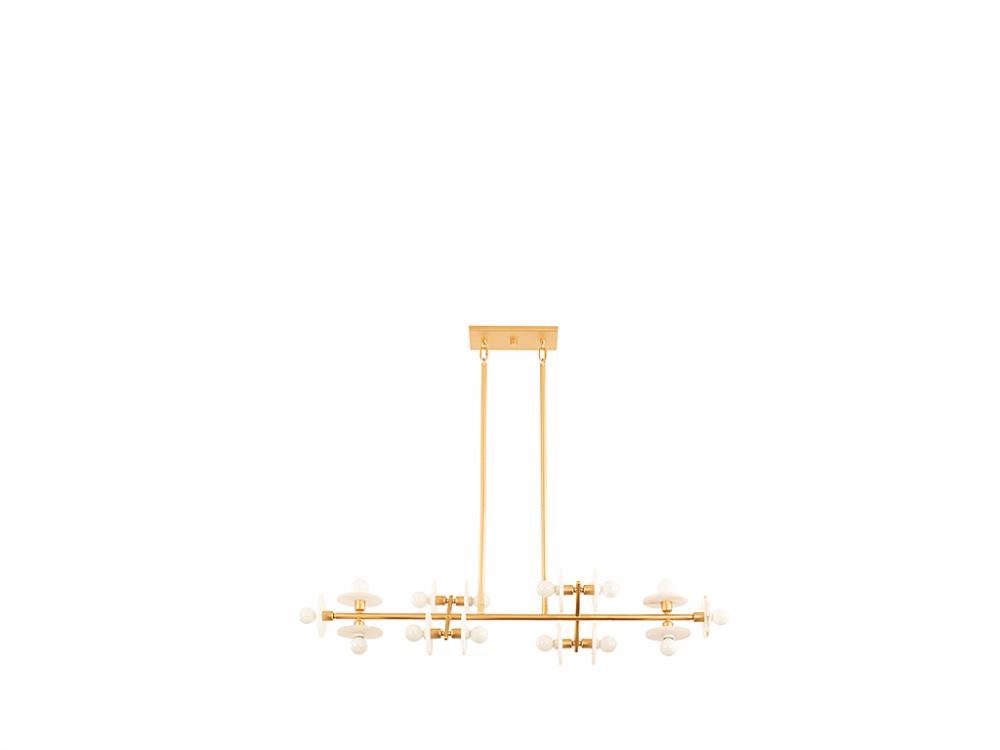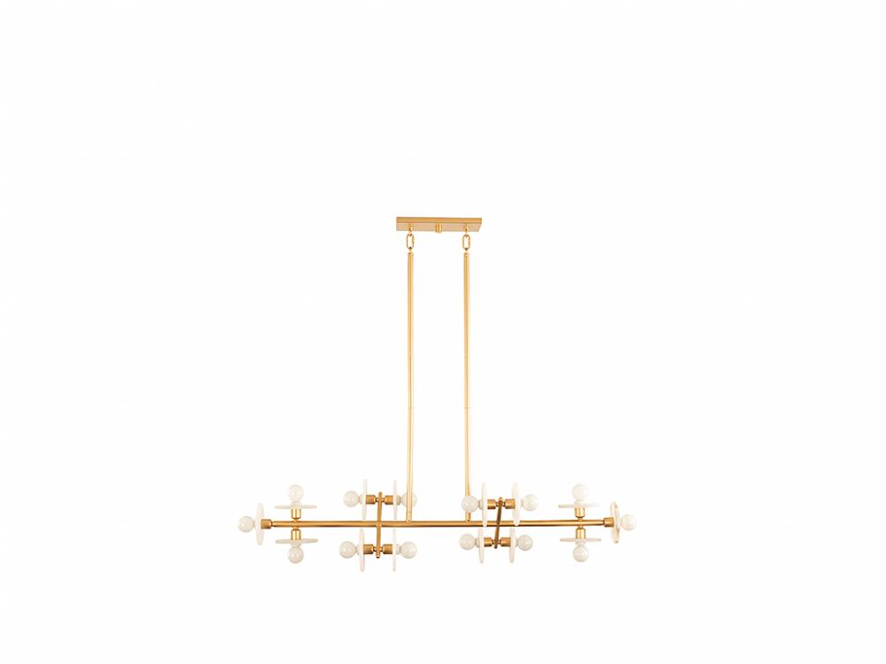 Discs of alabaster stone take center stage in the otherwise subdued design of the Savoy House Amani 14-light linear chandelier. The natural beauty of the alabaster is offset by a lovely gold finish, creating a look that pops. Amani is 10.13" in height, 48" in length and 10" in width. It uses 14 standard size bulbs of up to 60 watts each (bulbs not included). Comes with eight 12" downrods and two 6" downrods.