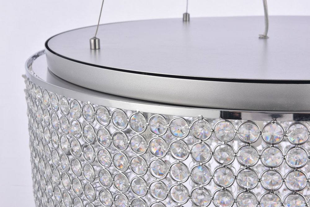 Like a brilliant shining star, the Amelie collection of hanging fixtures emits dazzling light from a bejeweled circular band, accented with gleaming strands of royal-cut crystals pouring through the open center. This chrome-finished ring surrounds four to 10 lights (not included) that highlight the intricate pattern of miniature circles that embellish the sides and bottom of the frame. in natural light, or with electricity, this sparkling hanging light would become a stunning showpiece for your space.