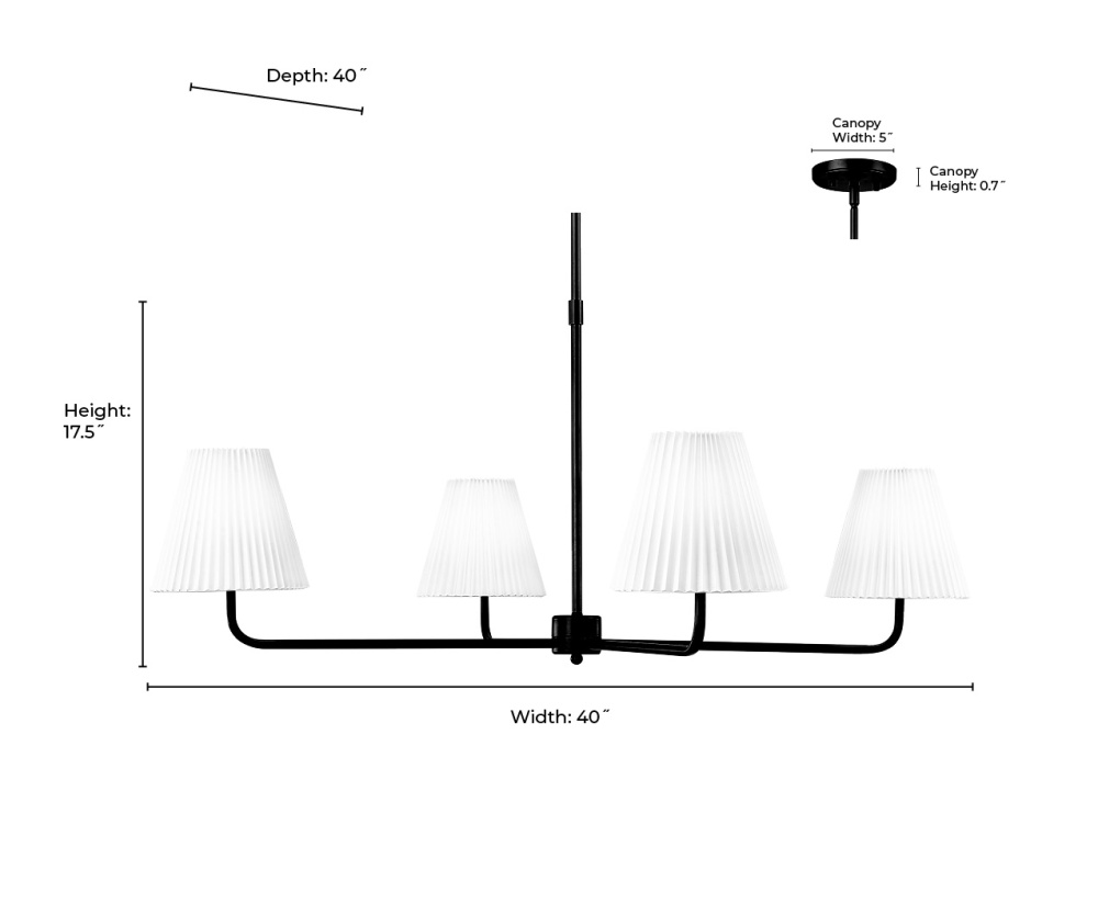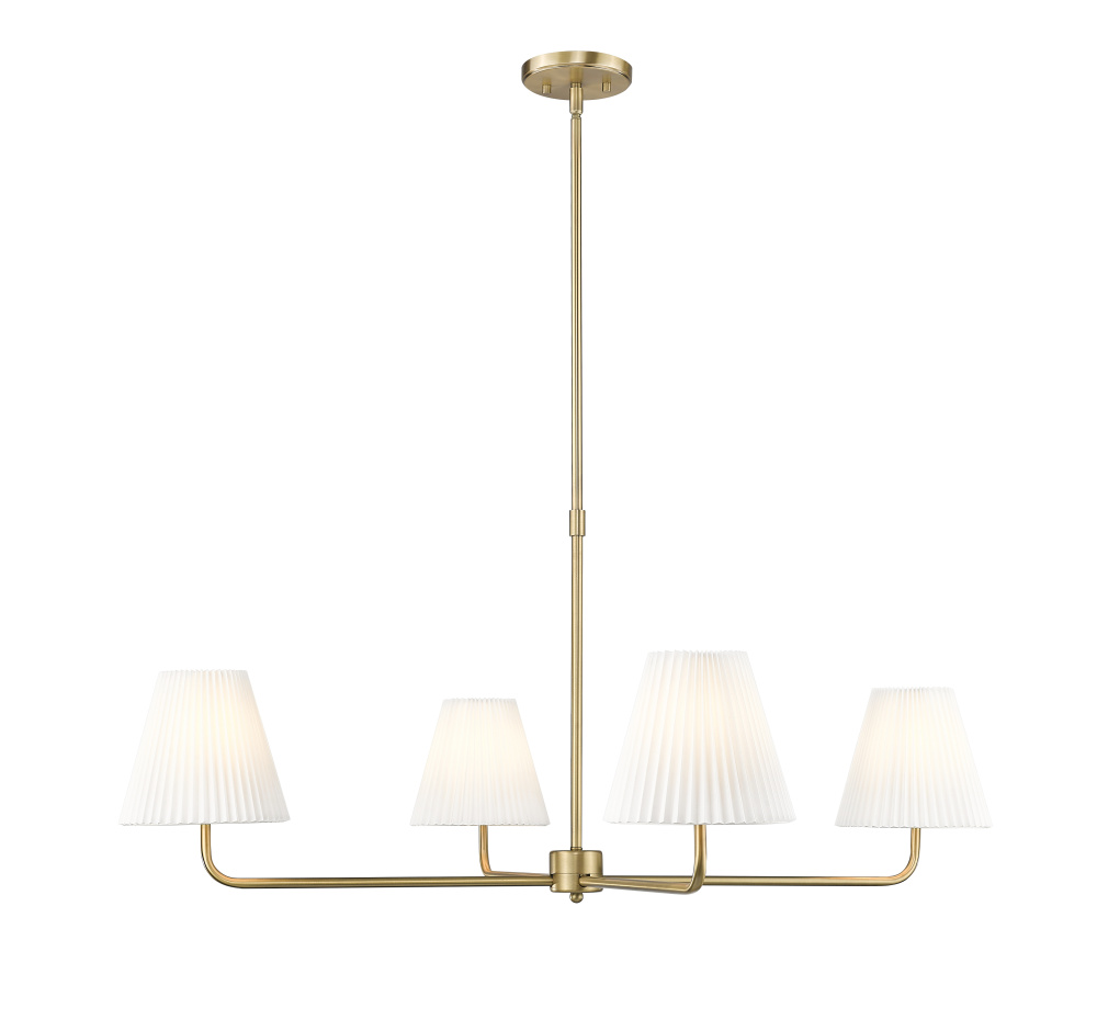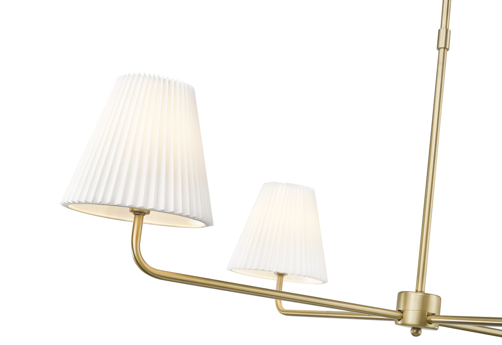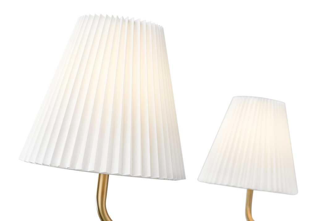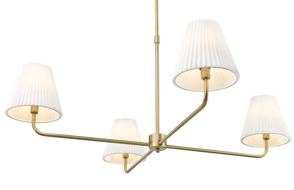 The Ami Family beautifully synthesizes a modern profile with traditional styling to create a thoroughly unique design aesthetic. The fixtures, finished in either matte black or vintage brass, are comprised of crisp, clean lines arcing gently upwards and capped with vintage style white fabric pleated shades. Available as 1-light sconces, 2-light island pendants, and 4-light chandeliers, these fixtures create a light and airy aesthetic for any space.