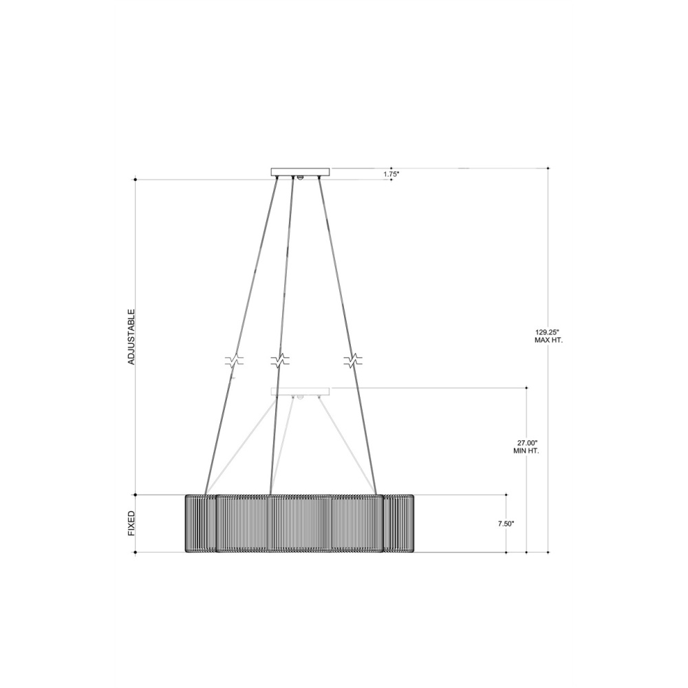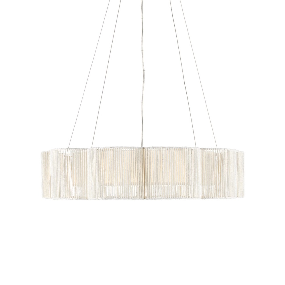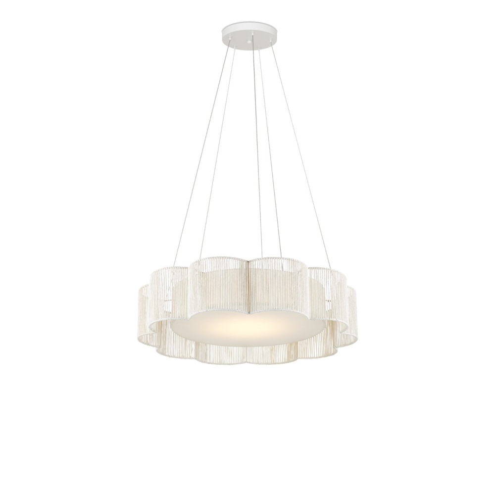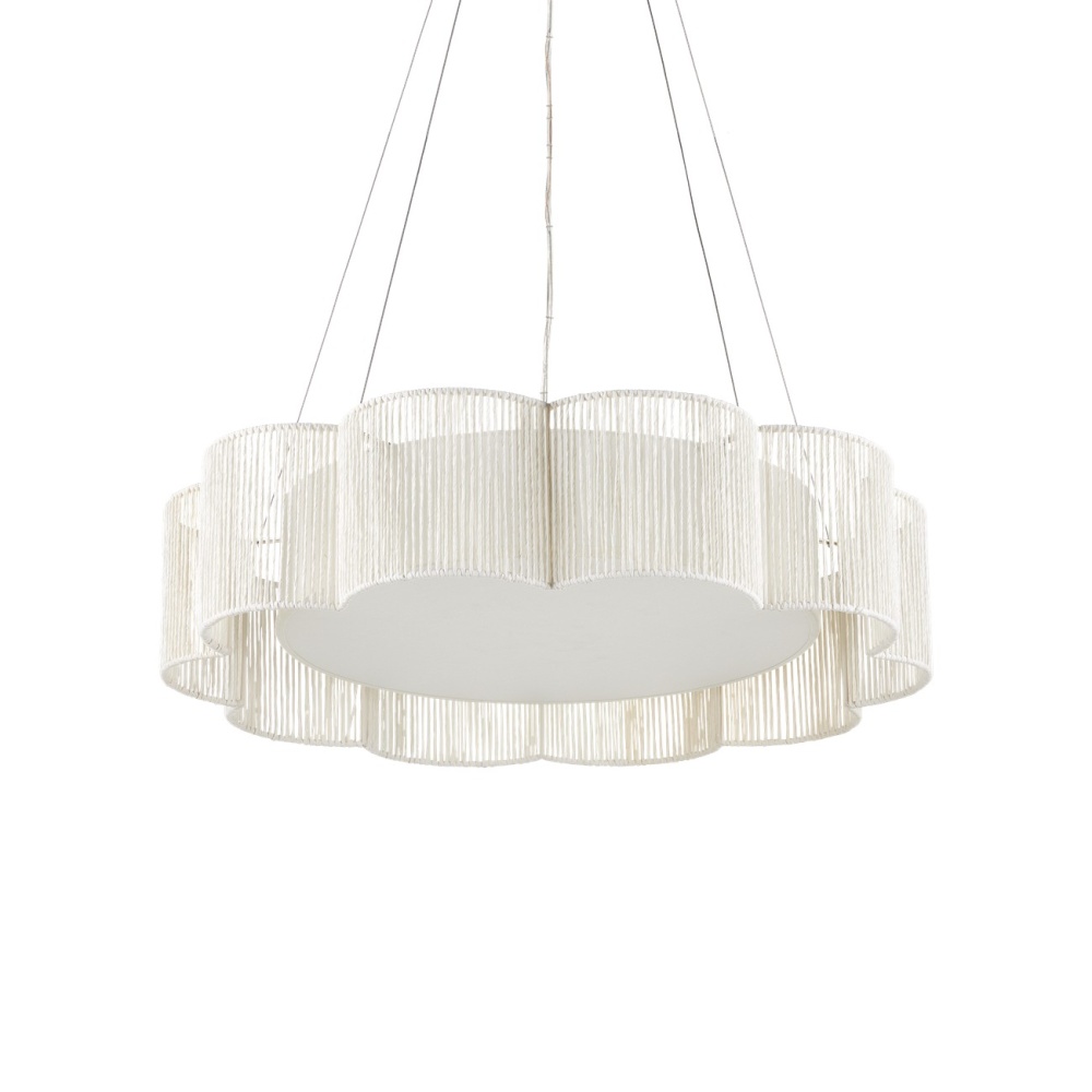 Scallops of Kraft paper twine fold around the wrought iron frame of the Ancroft Chandelier to form a delicate flowing silhouette. The string has a white finish that works in concert with the contemporary silver leaf on the metal to keep the white chandelier light and airy. This is enhanced by the fact that it is hung from aircraft cable, which is adjustable. The integrated LED light flows through a diffuser fitted to the bottom of the shade. Adjustable from 27" to 129.25" with use of included chain/rod kit/cable. If your space calls for a longer drop, additional chain/rods/cable is available for purchase.