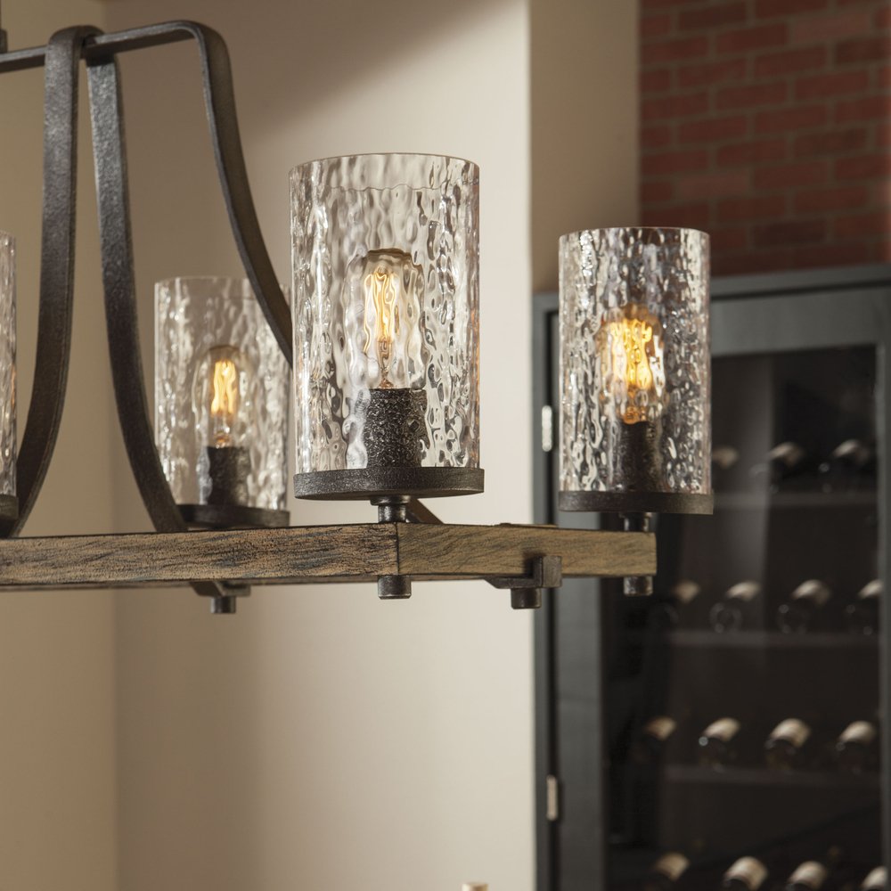 Influenced by both rustic and industrial design, the transitional Angelo chandelier collection by celebrates the beauty of imperfection and the visual impact of mixed materials to create an overall rugged look. The cylindrical Clear Thick Wavy glass shades complement the two-toned finish of Distressed Weathered Oak on the outer structures and a new pitted, richly textured Slated Grey Metal finish on the sloping arms for a rustic but tailored look. Perfect as foyer lighting, living room lighting, or paired over a dining room table, and the largest fixture will be the crowning touch to any great room.